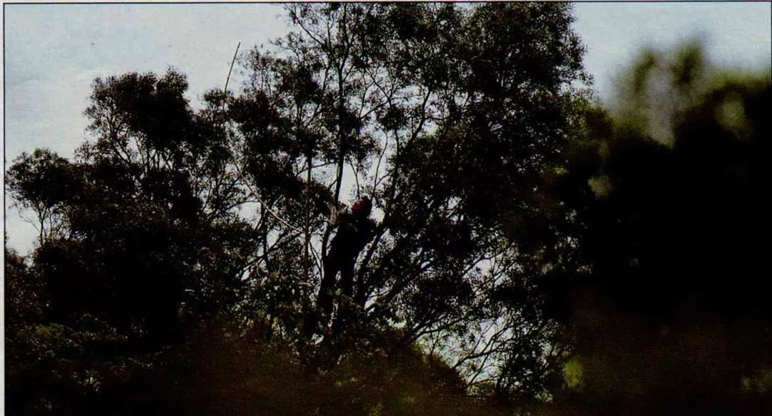 彰化八卦山麓灰面鷲遭難。一名違法獵捕猛禽者,正從樹上取下誤中陷阱的灰面鷲。(黃光瀛提供)(黃光瀛提供)