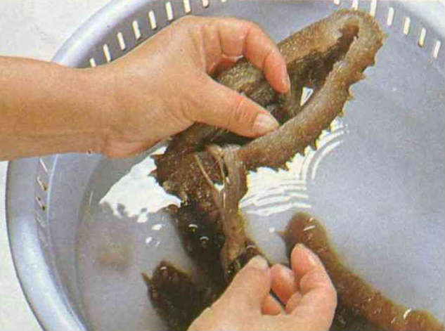 乾海參須先以冷水泡上20∼30分鐘,再換清水加熱,待滾即改小火續煮30分鐘。先連水冷卻,再換清水泡至第二天。如此同樣過程要持續七次,才算發泡完成,手續十分麻煩。