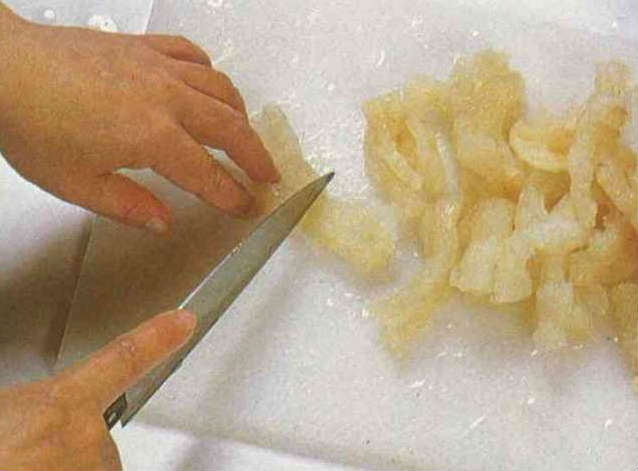 1.蹄筋洗淨擠乾水份,切成片段。