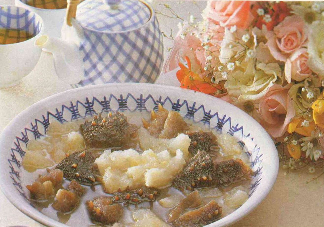 2.海參與蹄筋皆是低脂、低醣,且富含膠質的食物,非常適合老年人及減肥者食用。又海參中另含豐富的鈣及蛋白質,經常食用,可使皮膚、指甲及頭髮健康、有光澤。
