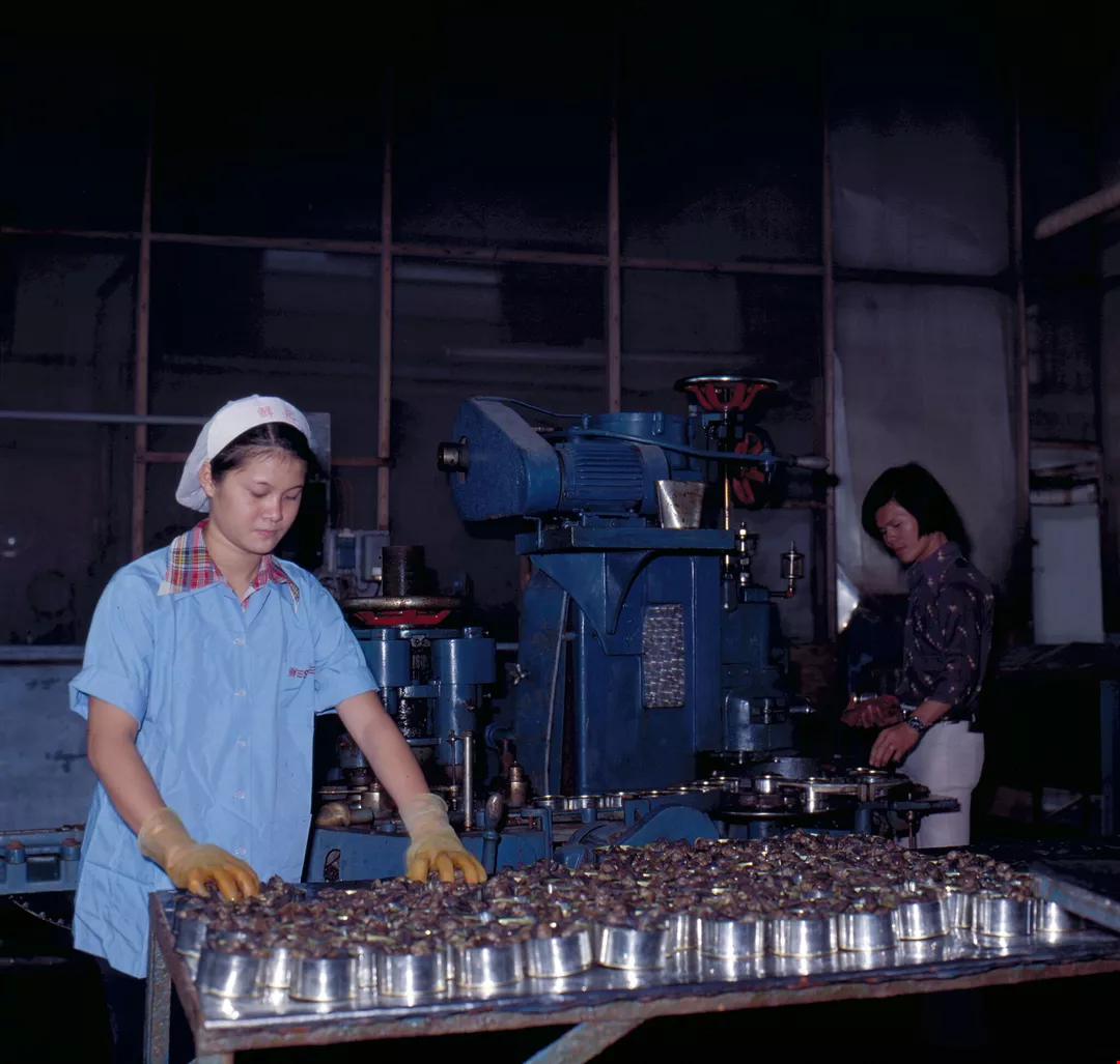 清洗後再度殺菁,接著用選別機依大小分為五級,再做一番檢查修整的工夫,把不合格的原料肉剔除,然後過磅裝罐,加入用香料泡成的填注液,脫氣封罐後,用高溫殺菌,再經過冷卻包裝。