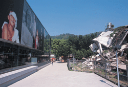 面對地震留下來的斷垣殘壁與一旁新建的地震博物館,