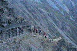 玉山海拔三千五百公尺以上的高山寒原地帶,土壤乾旱、石粒裸露,有強風、重雪,植物生長緩慢。圖為玉山主峰下風口一帶的險峻地形。