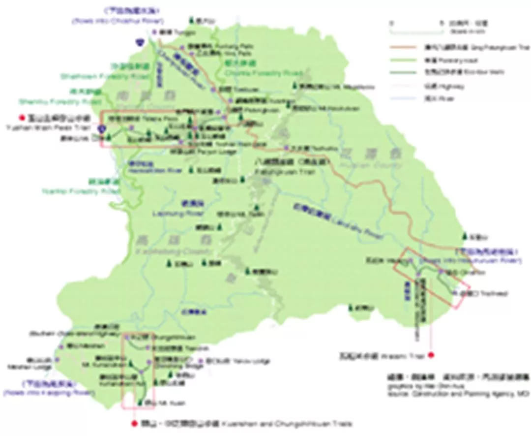 玉山國家公園及三條生態之旅地圖/繪圖:魏錦華/資料來源:內政部營建署