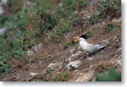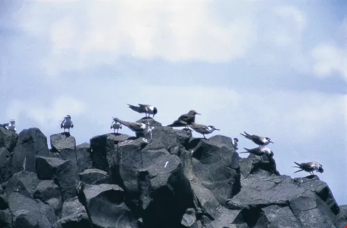 澎湃的浪濤與絕頂岩礁是許多鷗科鳥類的棲息環境,台灣常見的夏候鳥──燕鷗,常集體築巢於島嶼的懸崖或地上。圖為澎湖無人島的白眉燕鷗。