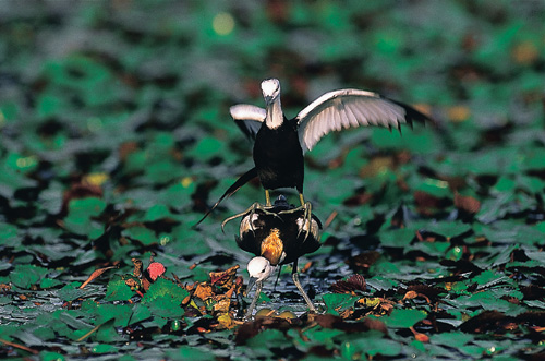水雉的大腳趾張開可長達15公分,有助於分散體重在浮葉植物上行走。圖為水雉交尾。