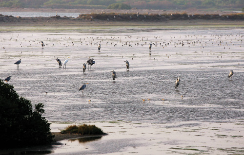 一批批愛鳥人也沿著曾文溪北岸堤防,前往位於台南縣七股溼地、黑琵數量最多的「黑面琵鷺保護區」,這片方圓300公頃的淺水沙洲,是這群遠方嬌客在台停留的主棲地,聚集了數以百計的黑面琵鷺。從高倍的單筒望遠鏡望去,排排雪白身影悠哉佇立在水波中,多數鳥兒扭頭將長長嘴喙埋在背部休息,有些則一邊走動,一邊將長嘴伸入水中,不疾不徐地左右掃動覓食,隊伍盡頭還有三兩隻正展翅潑水洗澡,洗完澡的鳥兒還用長長的黑嘴相互逗弄,為對方梳理羽毛。