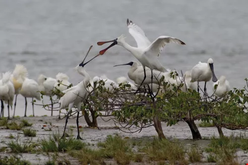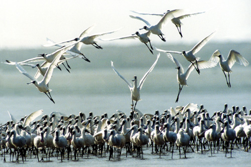 每年冬天黑面琵鷺自寒冷北方翩翩來到台南縣曾文溪口,優雅的身影為台灣海景增添靈動的一幕。