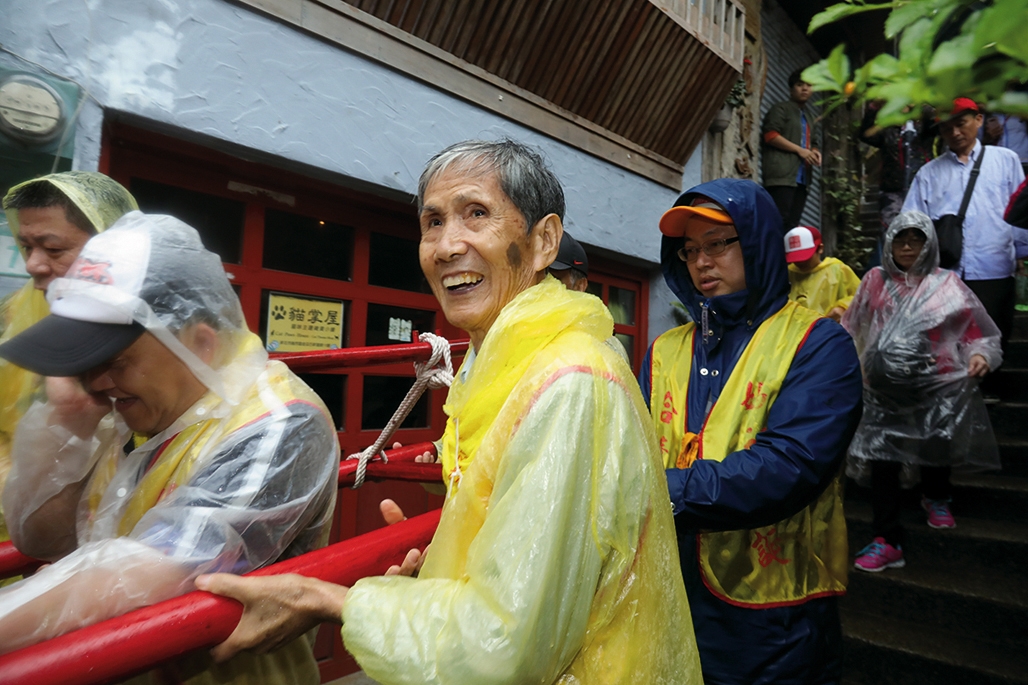 轎夫中還有一位85歲的陳石城,脖子上掛著的毛巾擦掉汗水也擦雨水,參與了數十年扛轎工作,他笑著說:「你上網找『淘金達人』就可找到我!今年人手多,比較沒有扛到啦!」
