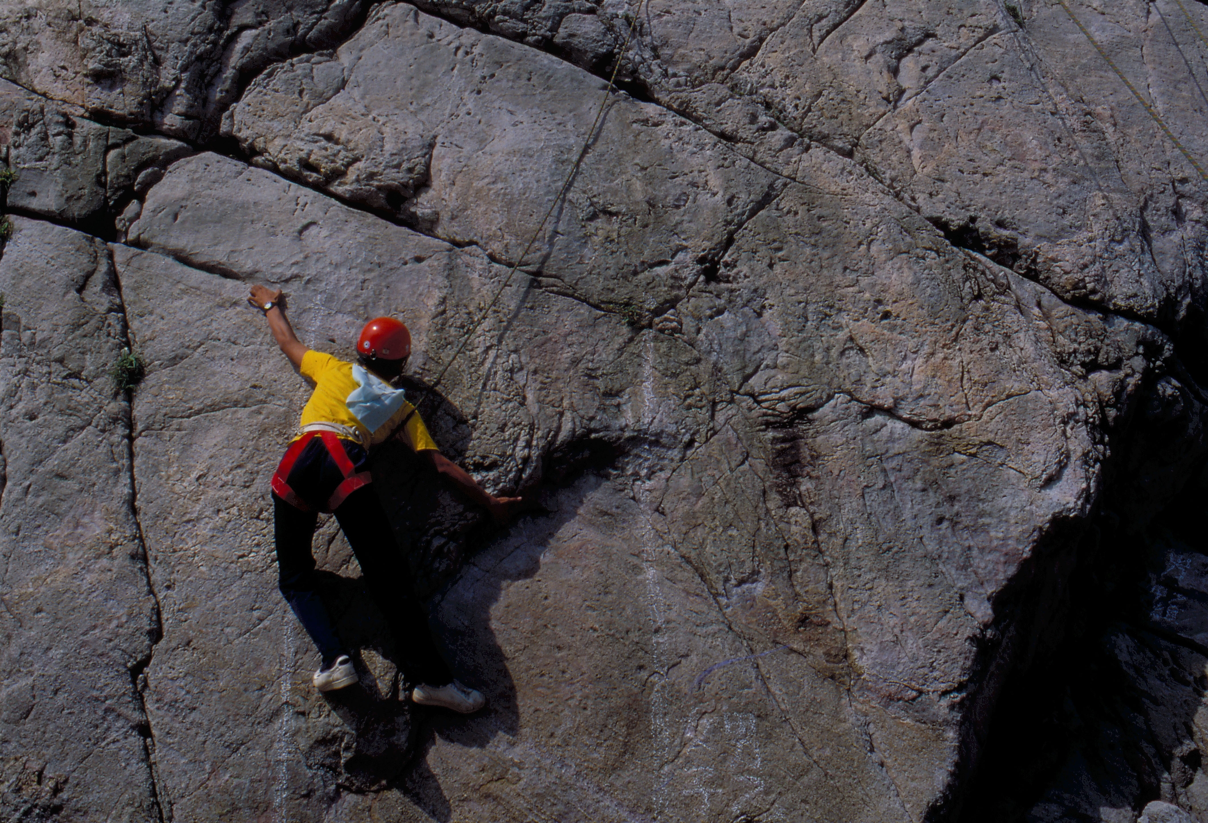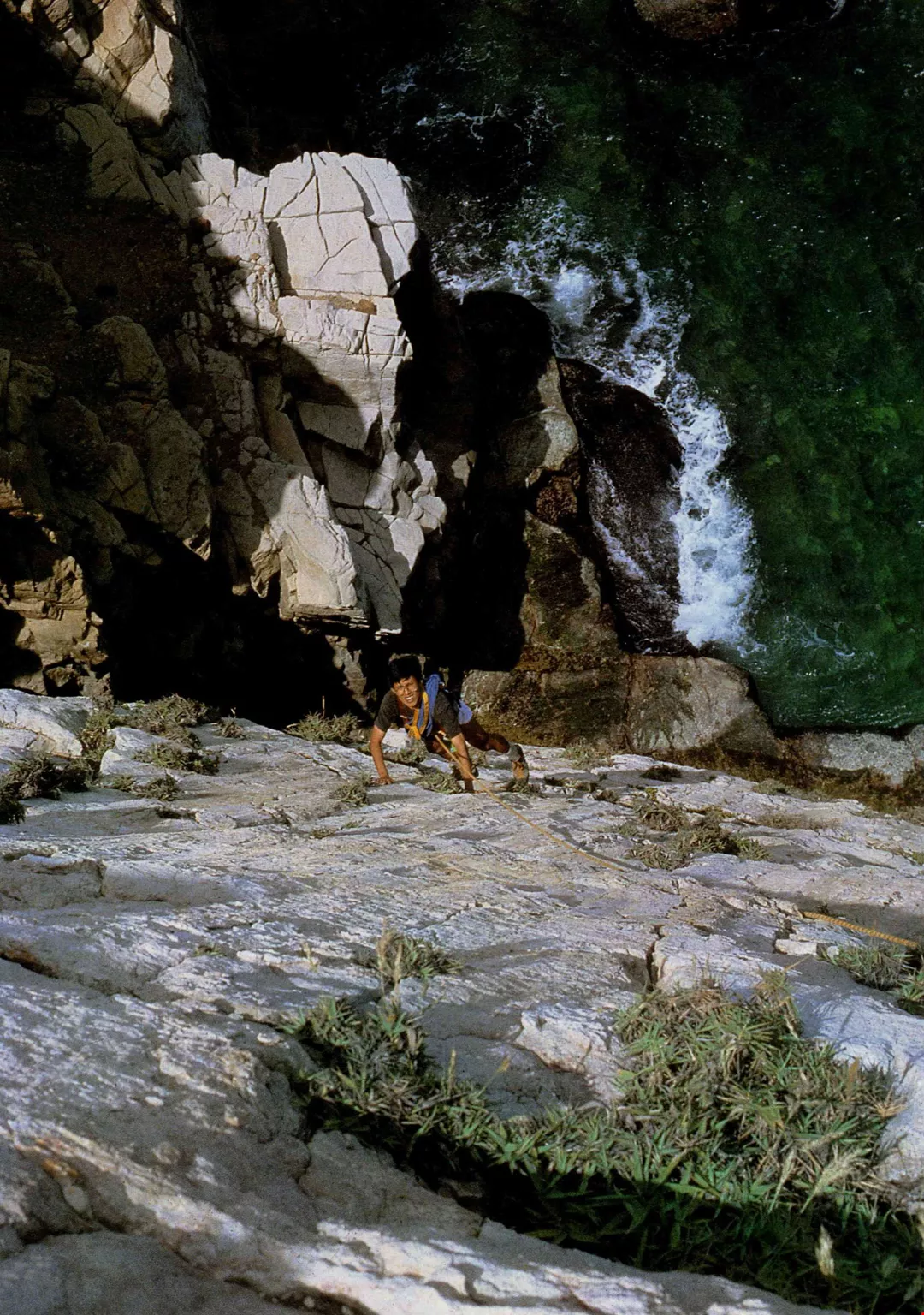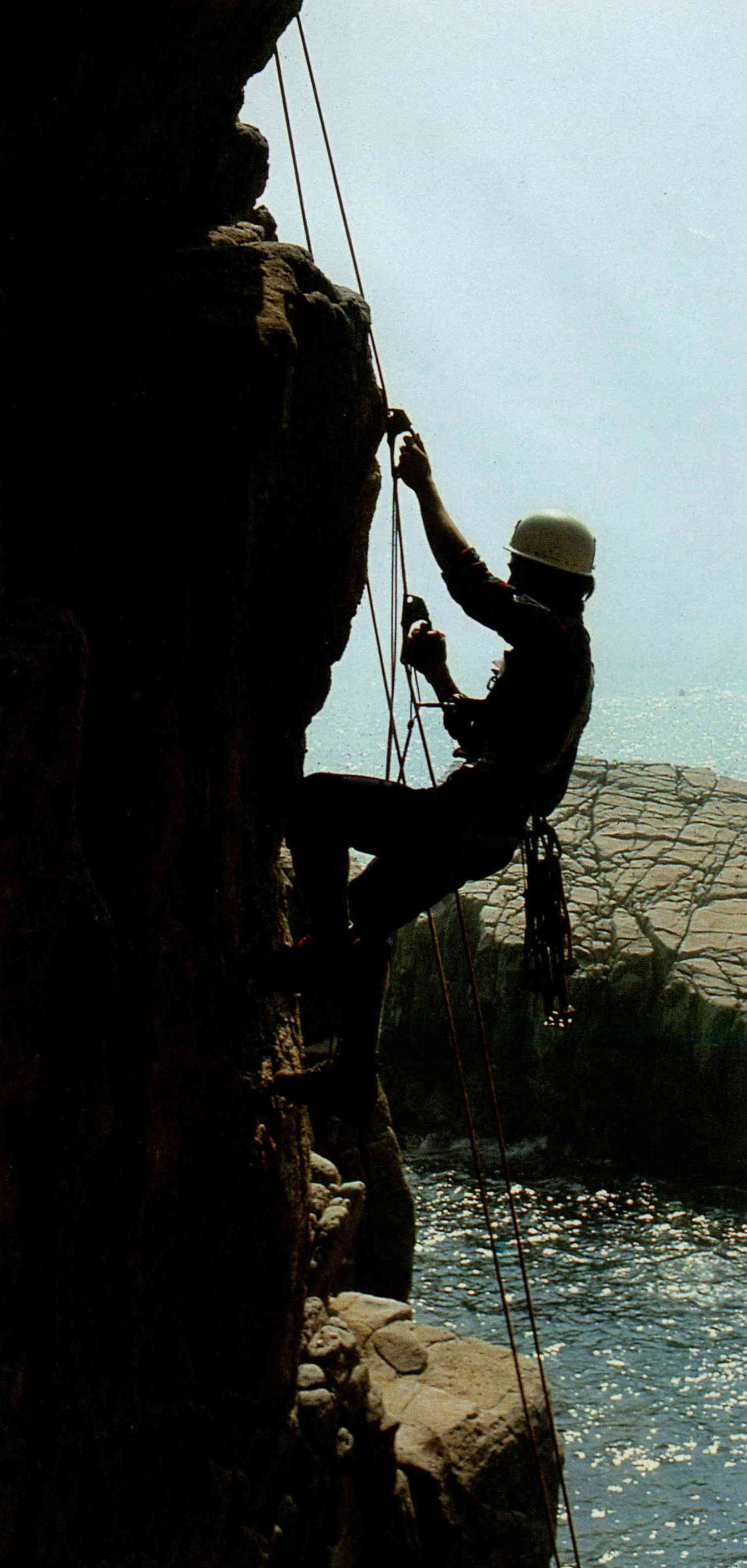 而且,攀岩一定要有伴同往。上崖時,有上方的同伴為其「確保」——已先將繩索綁在固定的支點,擲給後續者綁在身上,然後以手操繩接應;若是「開路先鋒」,上方無人「確保」時,則須每攀升一段,就在岩壁上架設可供身上繩索固定的支點。