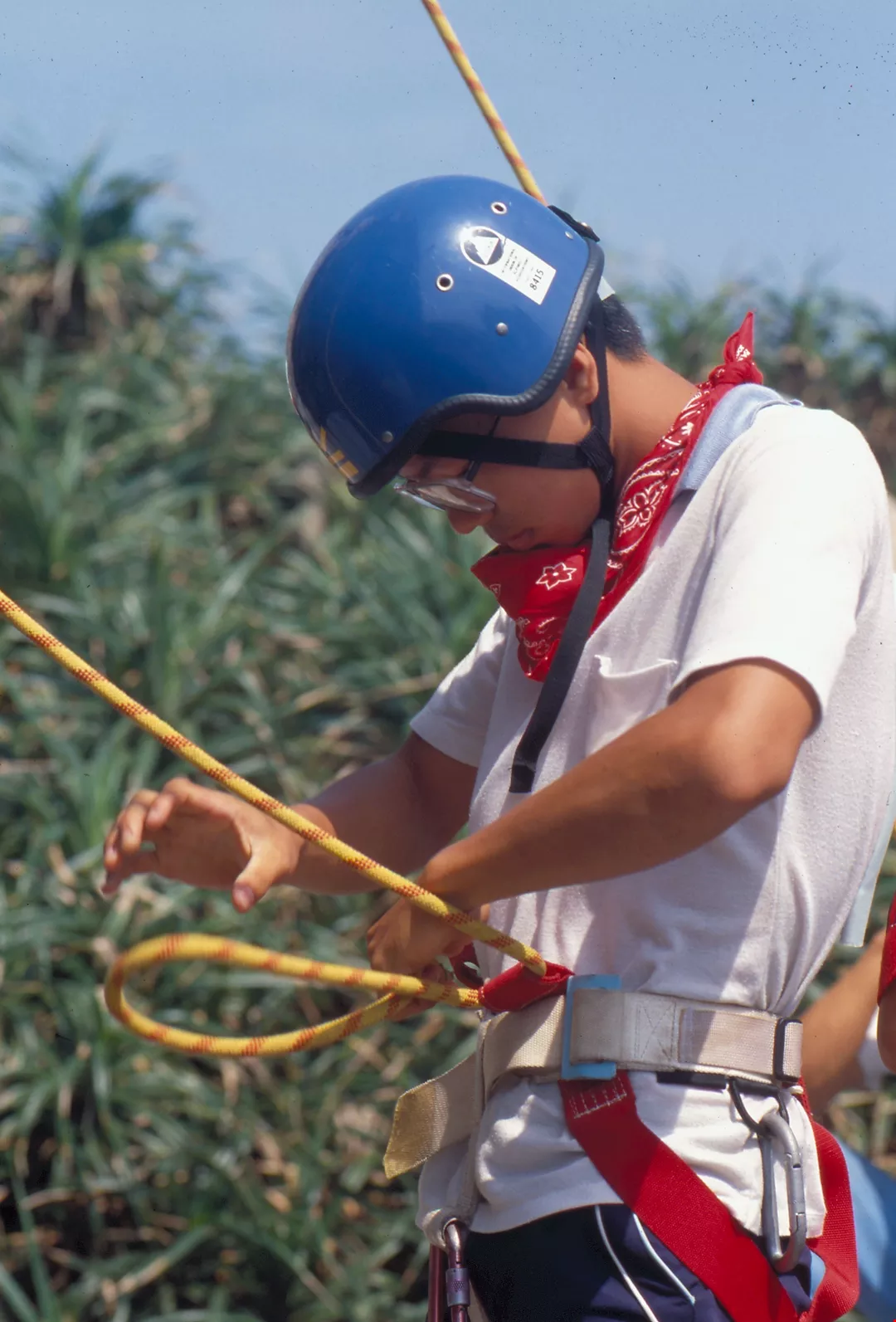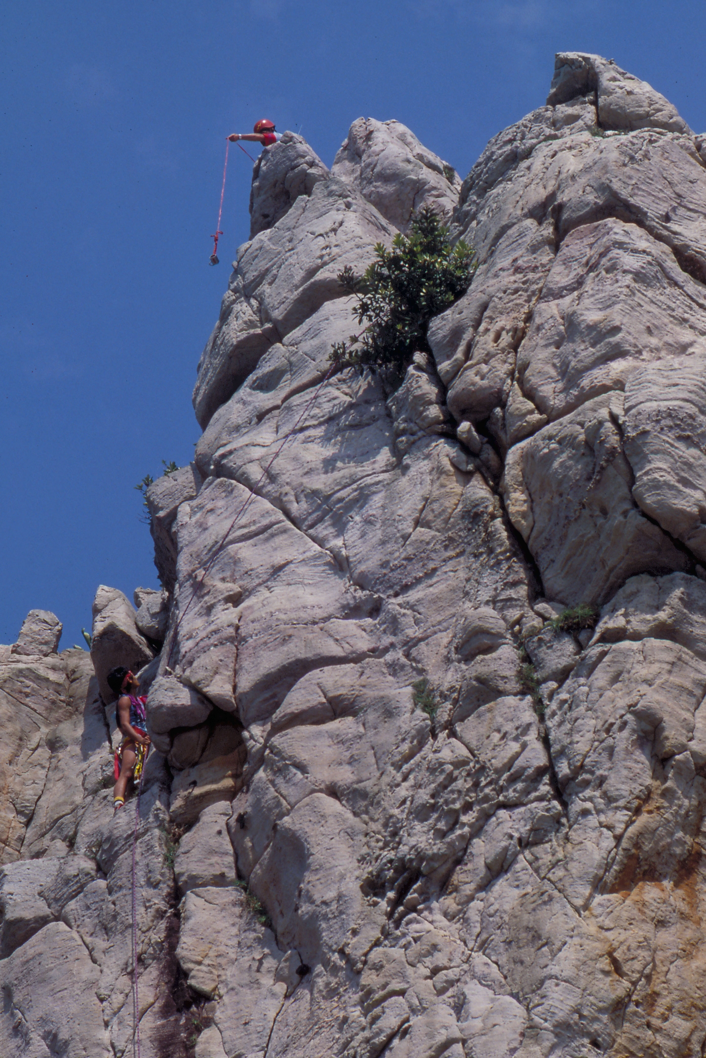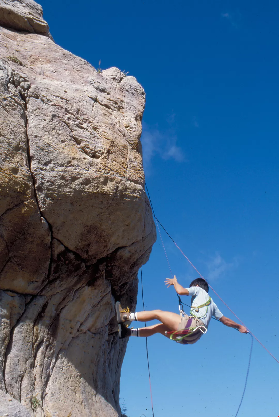 而且,攀岩一定要有伴同往。上崖時,有上方的同伴為其「確保」——已先將繩索綁在固定的支點,擲給後續者綁在身上,然後以手操繩接應;若是「開路先鋒」,上方無人「確保」時,則須每攀升一段,就在岩壁上架設可供身上繩索固定的支點。