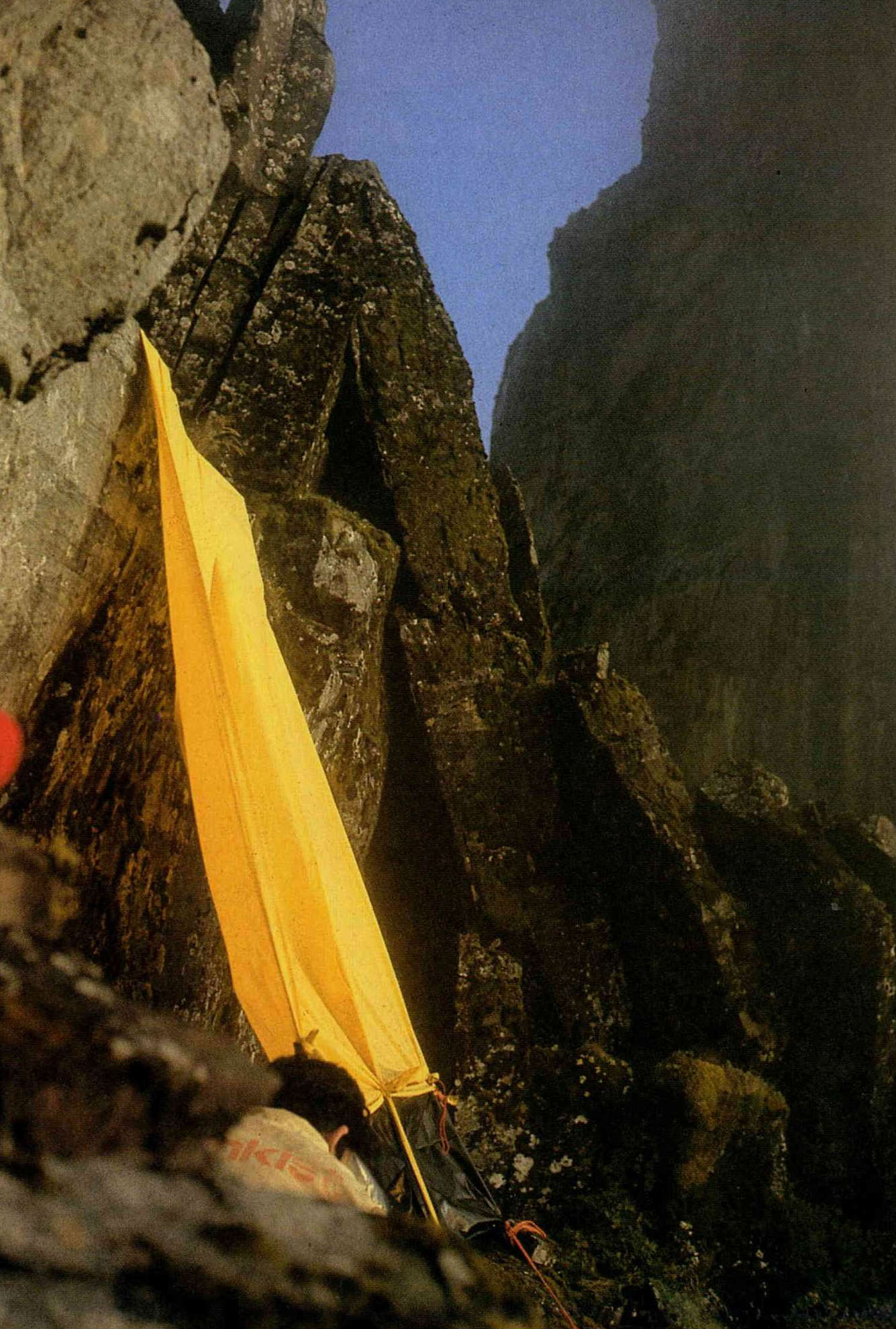 這可不是普通的山腰!此乃大霸北壁上的神仙台,寬只有1公尺,爬到一半的攀岩者,正搭起雨衣充當帳蓬,準備在此過夜。(鐘永和/陳敏明/何中達)