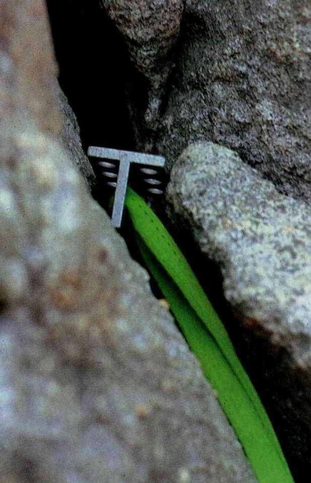 為了不破壞岩壁原貌,攀岩界逐漸揚棄釘入式的錨樁,改用各種岩楔卡在岩縫中架設支點。(鐘永和/陳敏明/何中達)
