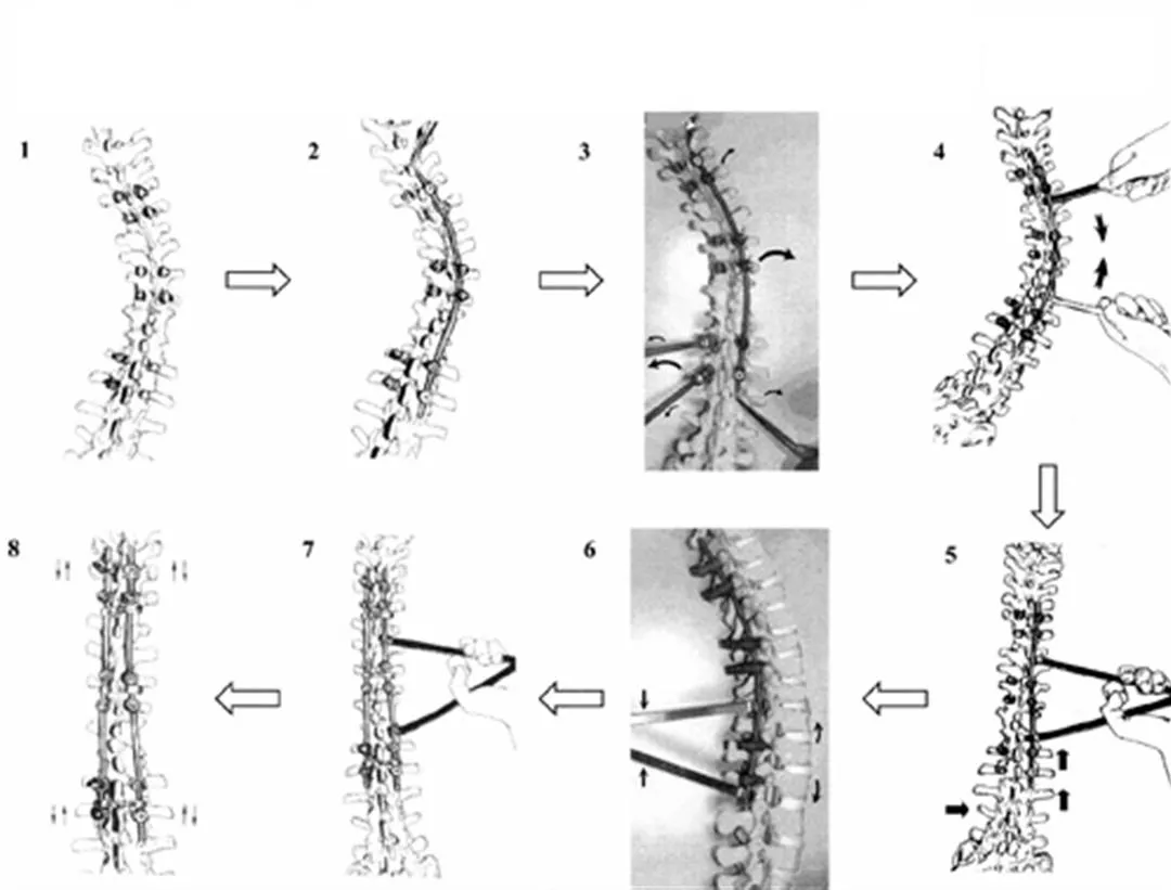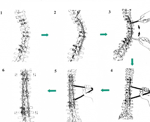 槓桿法與傳統手術最大不同在於,省略了鬆解僵硬側彎畸型的前路手術,全採後背下刀的「後路手術」,也就是在病患背上劃下一刀,剝開脊柱周圍的肌肉後,就手持電鑽在一節節的椎弓根上打洞。以側彎153度的病患為例,一共打上28根鋼釘,當成基樁牢固的施力點,再以細長鋼條將鋼釘串連、緊緊鎖住,接著利用槓桿慢慢地將一節節走位的脊椎扳正,最後再把另一邊的鋼條鎖起來,形成兩條穩固的鐵軌,成為支撐扳正後脊椎的樑柱。(圖示一)