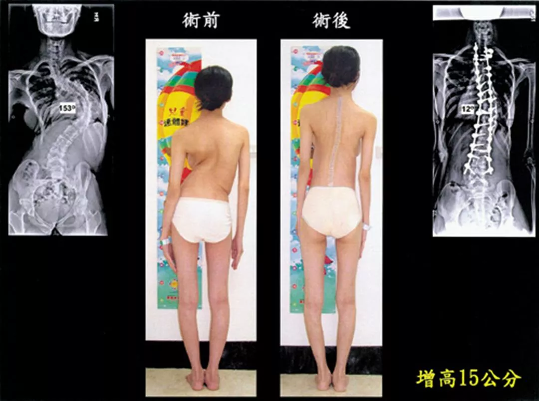 從X光片與病患裸露後背的照片,比較手術前後的差異,可以清楚看到病患胸椎原本153度的側彎,已經被拉直,還長高了15公分。