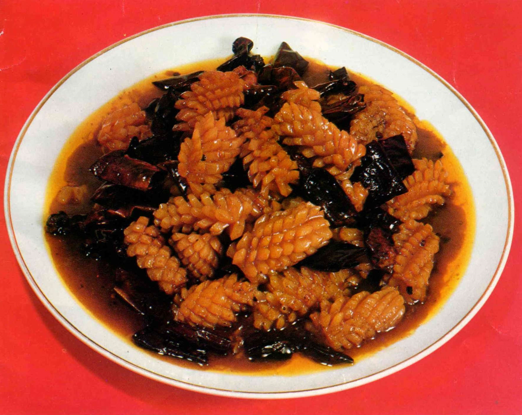 發好之魷魚兩條,剝下腳部後,將魷魚身先直切成兩大塊,再在反面(無紅膜之一面)斜刀交叉切入密細之間隔花刀,然後再直切成兩條,並分割成一寸多長之斜段(菱角狀)。將油三杯燒熱後放下魷魚塊炸成卷曲狀便撈出,將油倒出,另燒熱三湯匙油在鍋中,落下切段之乾辣椒,慢慢炒炸至成黑色後,再加入花椒粒一茶匙同炒,待有香氣時,迅將魷魚卷與綜合調味料(醬油兩湯匙、糖一湯匙、酒半湯匙、及太白粉半湯匙、麻油少許)用大火拌炒至有黏性便速裝盤。