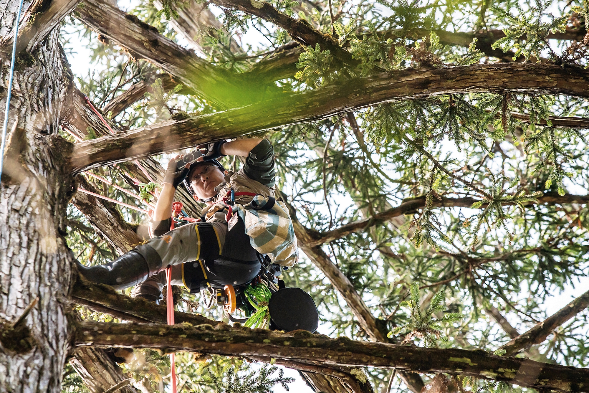 徐嘉君是研究樹冠層附生植物的森林生態學家,把自己弄到樹上是必要的技能。剛開始她學前人採種的方式,在樹上打L釘,踩釘上樹,後來改採攀岩的方式爬樹。