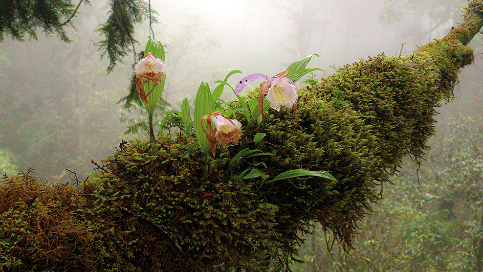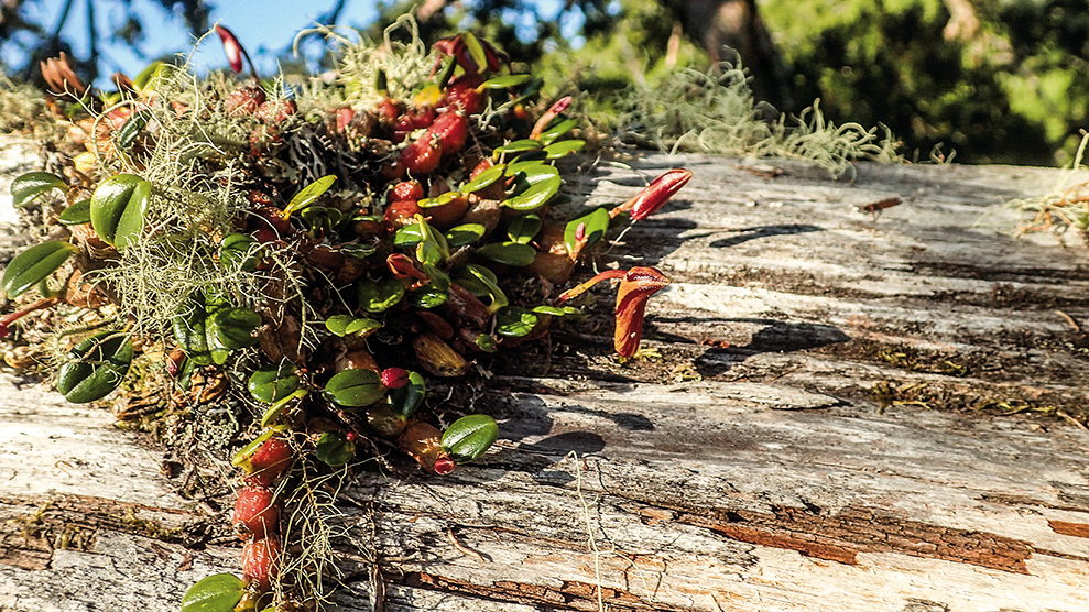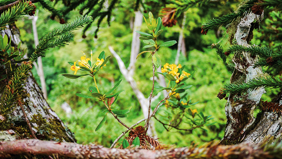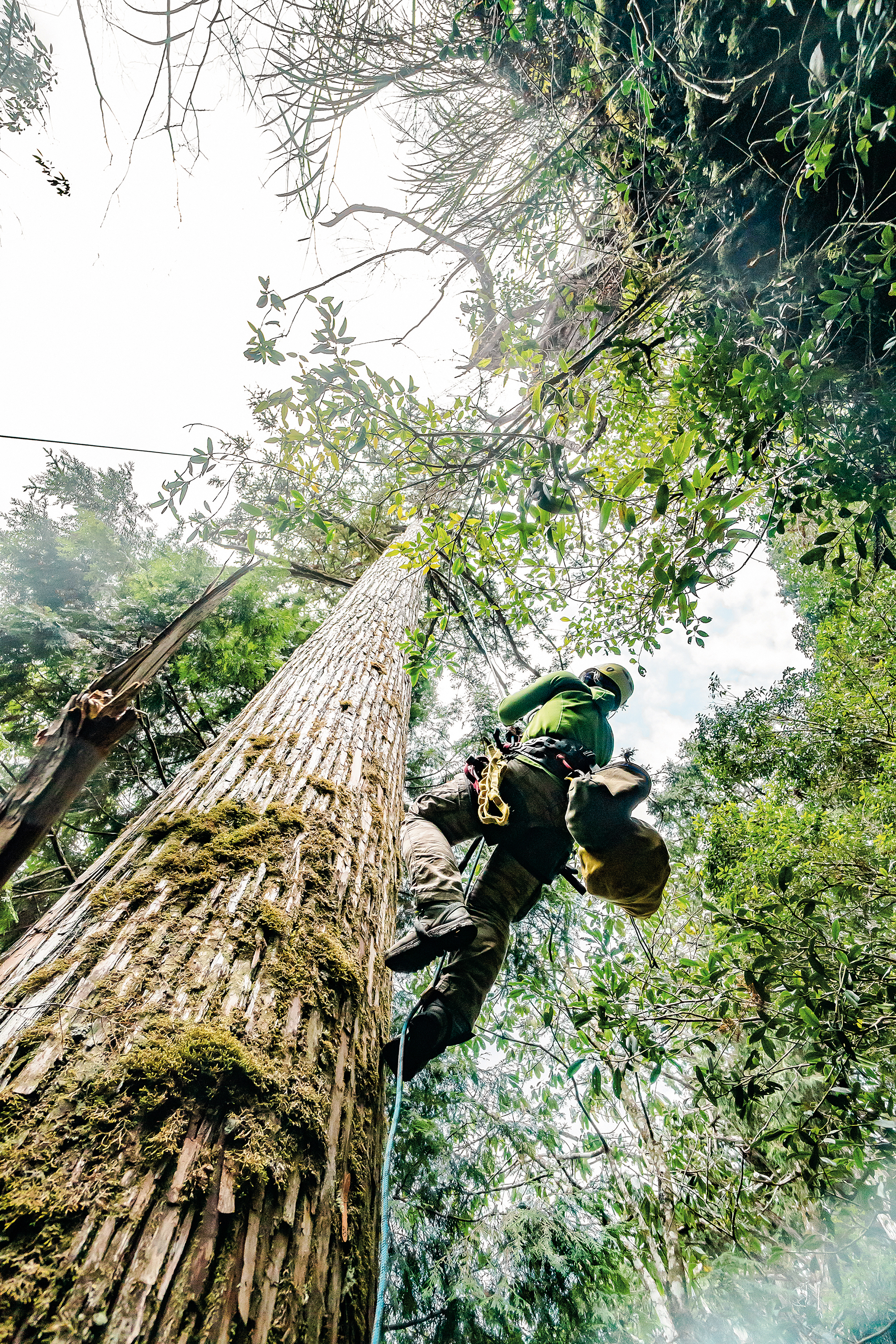 徐嘉君是研究樹冠層附生植物的森林生態學家,把自己弄到樹上是必要的技能。剛開始她學前人採種的方式,在樹上打L釘,踩釘上樹,後來改採攀岩的方式爬樹。