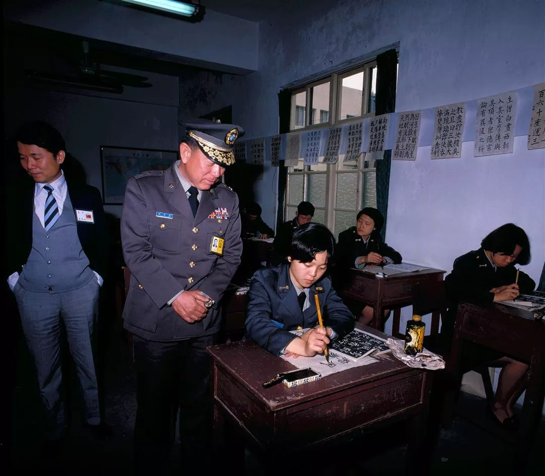 校長孟憲庭中將巡視學生課外社團活動書法社上課的情形。