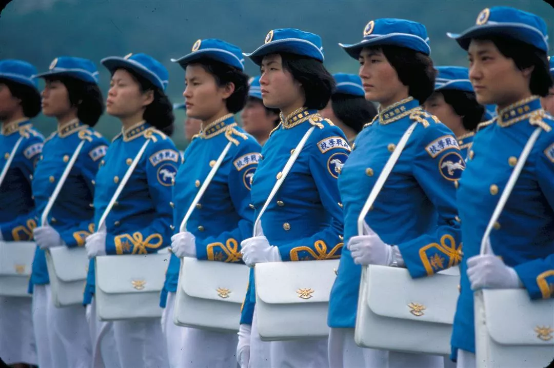 這是一支備受矚目的隊伍,隊伍的組成分子,是一個個年輕、修長、健美的女性,他們頭戴藍帽,身著藍衣、白裙,手戴白色短手套,肩上則掛著一個白色的皮包,左手搭在皮包上,右手擺動,姿勢標準,動作整齊。