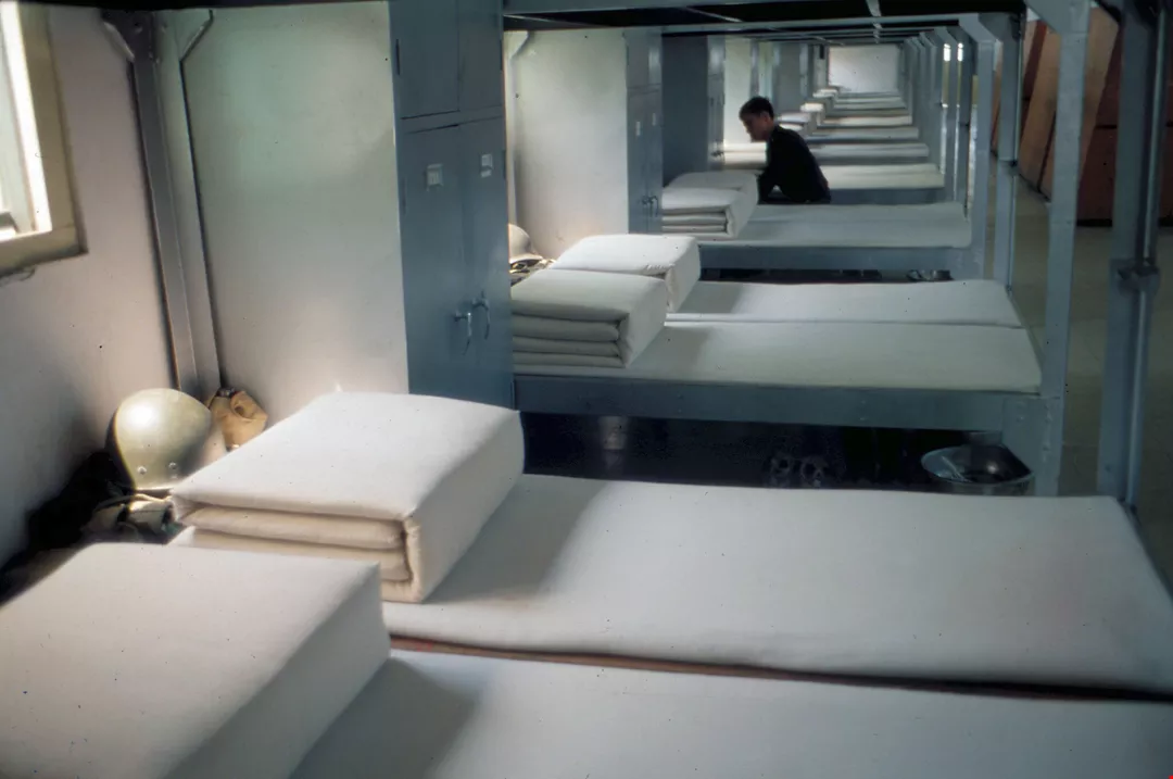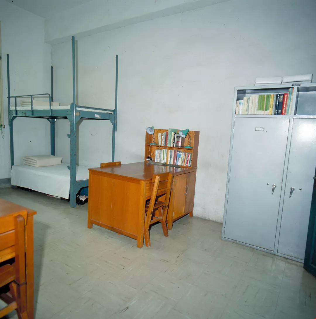 女生宿舍是四個人一間房,男生宿舍則為大統艙,床位排成一長列,共同的要求是:棉被摺疊整齊,東西按一定的順序擺在固定的位置上。