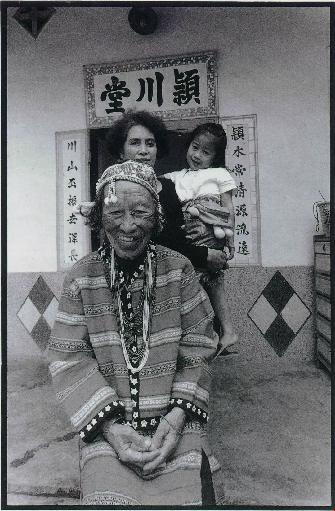 1993.12月.苗栗縣泰安鄉──今日的泰雅族人,在許多方面已經徹底漢化,圖為泰安鄉一戶泰雅族居民,家中文面的長者穿著傳統的服飾攝影,房舍上卻有著漢族宗族的堂號。這個堂號,是屋主目前的漢姓。(馬騰岳)