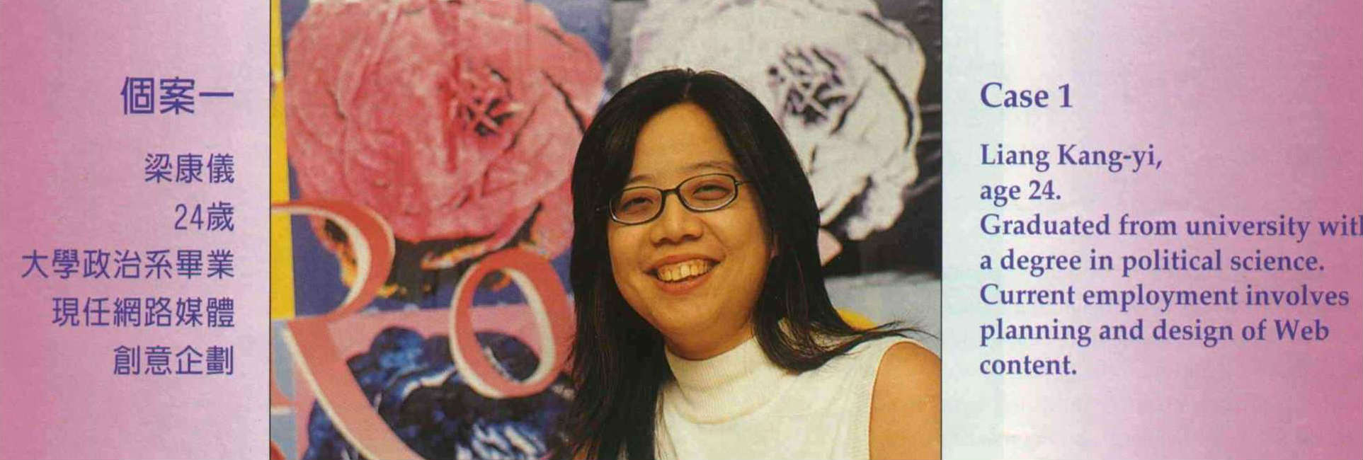 大三的時候我開始考慮以網路媒體作為我未來的職業,因為我已經完完全全「瘋」上了,多誇張啊,我搬家的時候都要先組裝好電腦,上了線,才一面和人聊天,一面整理東西。每天幾乎不上課的時間,都掛在網上,我有一半的朋友是網上認識的,連前男友都是,甚至還當了網站聊天室的室長。