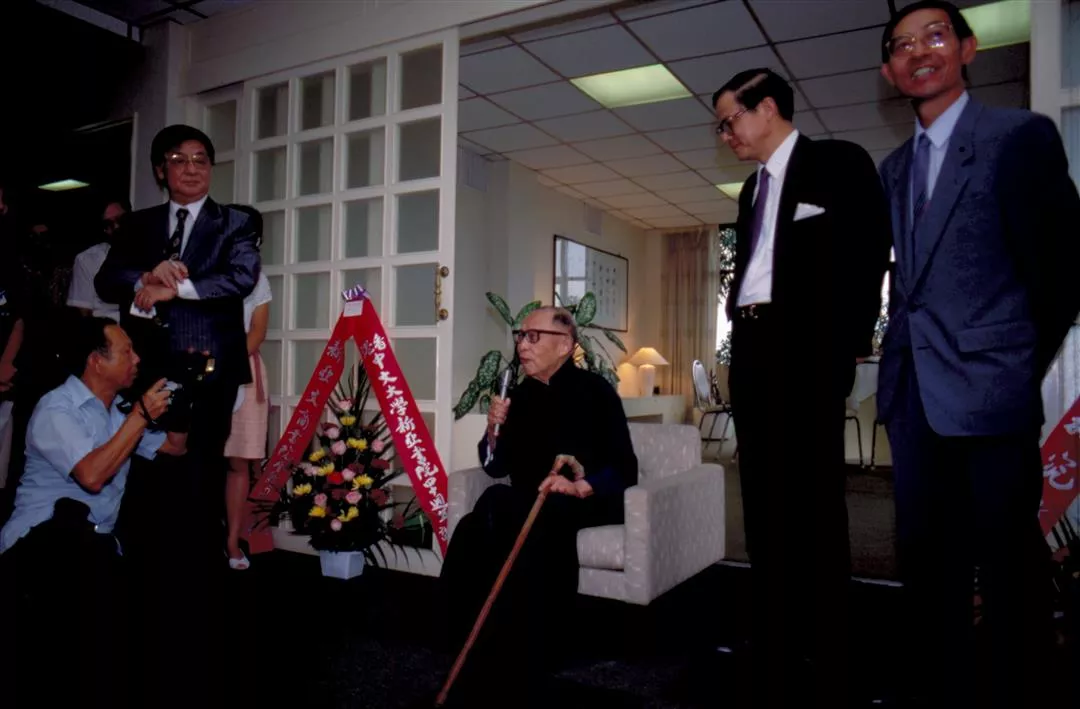 新亞書院四十周年院慶,鴻儒碩彥群聚一堂。圖中長袍者為從台灣來此道賀的國學大師錢穆,他也是新亞的「開山祖師」。(張良綱)