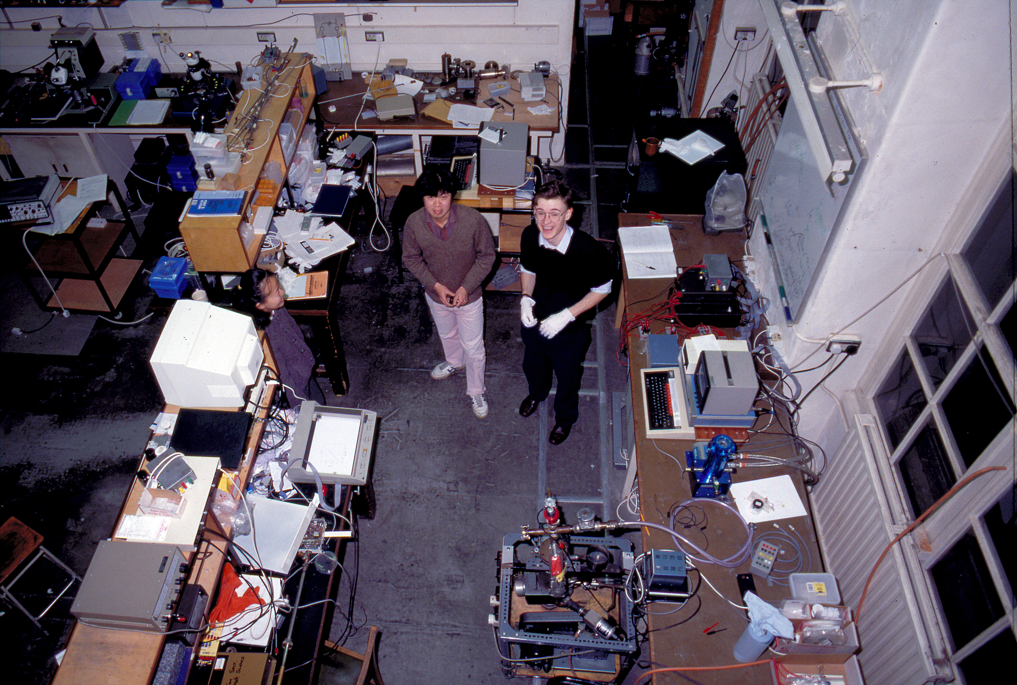 亂七八糟的管線纏繞銜接,其中許多是學生自己設計的、裝置的。圖為黃國雄與友人攝於實驗室。
