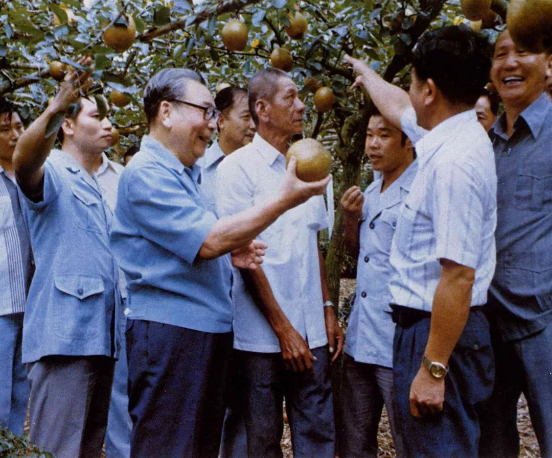 圖上:蔣經國總統經常找時間下鄉去訪問,他非常關切農友們的生活,也常在發掘出問題後,設法為他們解決。這是他去一個梨園訪問時的情景,手持著肥碩的大梨,他與果農同享豐收的喜悅。