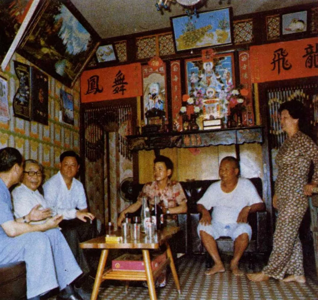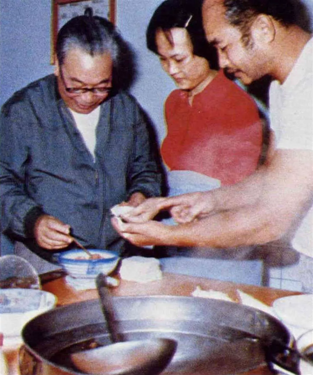 圖上:蔣經國總統在外出訪問時,總是就近吃個小吃就解決了用餐問題。他對於蛋炒飯、炒米粉、魚丸湯、肉羹等,甘之如飴。這張照片是他去一家小吃店吃餛飩時,誇獎店主煮的餛飩好吃,並且討教他們可有什麼秘訣?