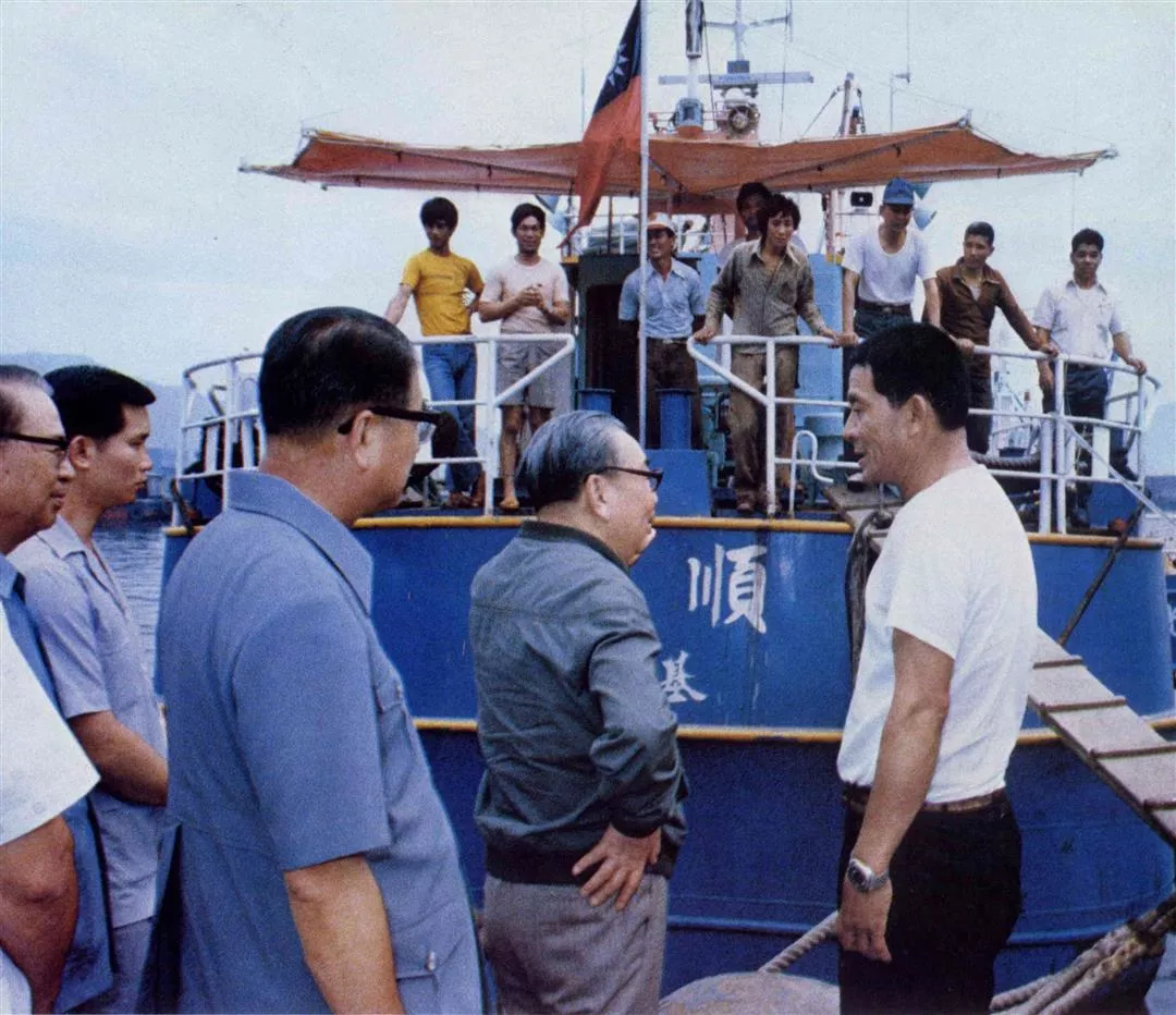 上圖:經國先生登高山,赴海濱,走遍了台灣每個角落,關切從事每一種行業的人。他常到漁村訪問,慰問漁民們危險、辛苦的討海生活。這張照片是他在蘇澳港登上一條漁船,和船主一家三代聊天。