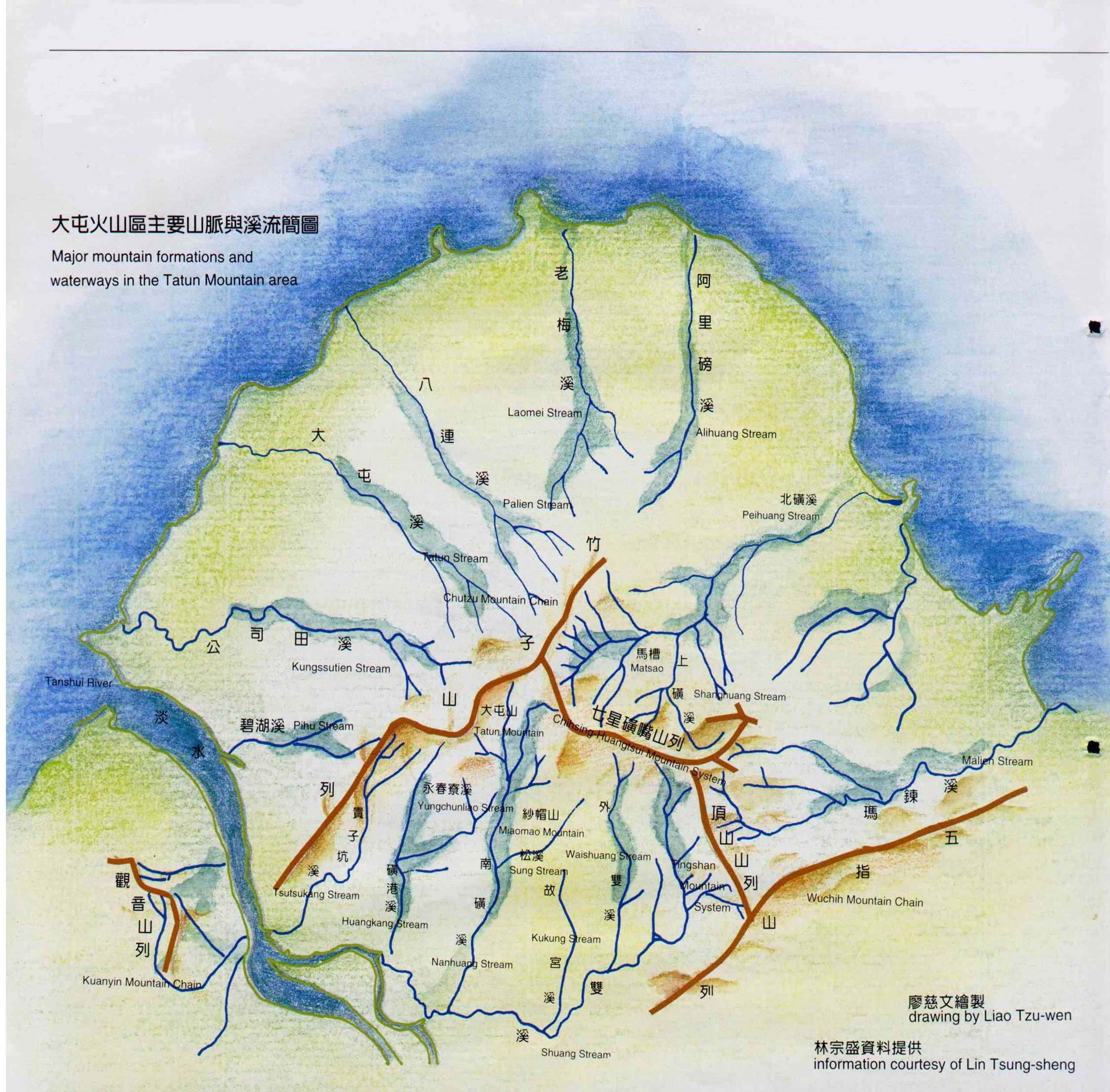大屯火山區主要山脈與溪流簡圖 廖慈文繪制 林宗盛資料提供。(林盟山)