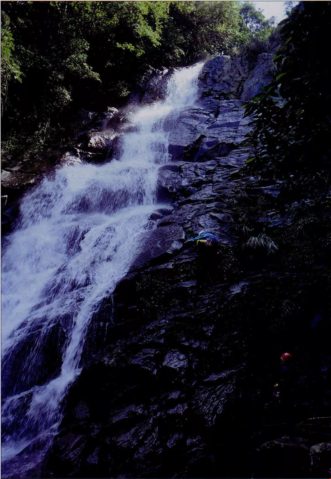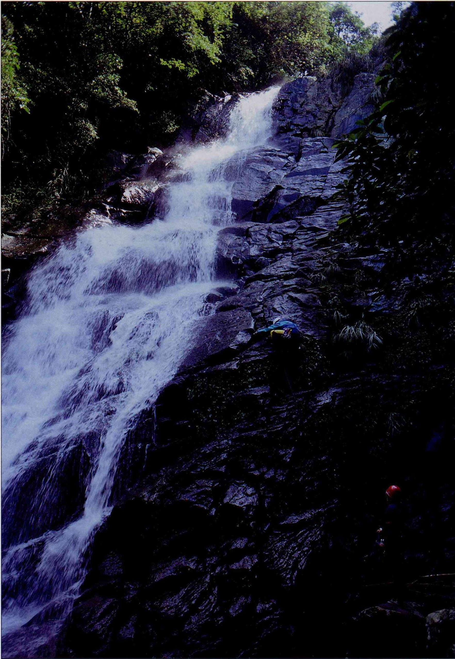 林宗聖一行人攀越大屯山區最大的瀑布老梅瀑布,為了地氈式調查大屯山區自然生態,他跋山涉水、無孔不入。(林宗盛提供)