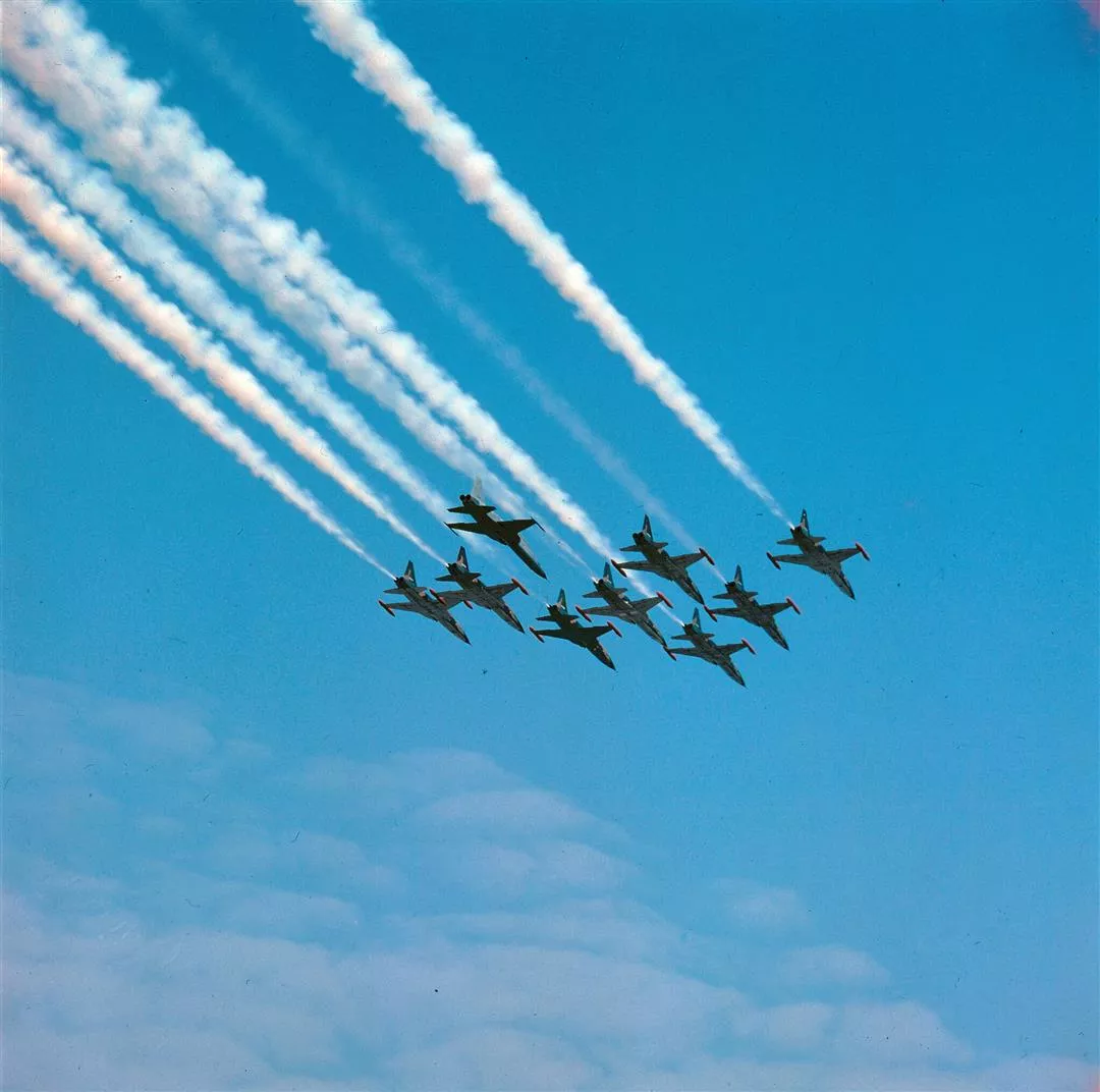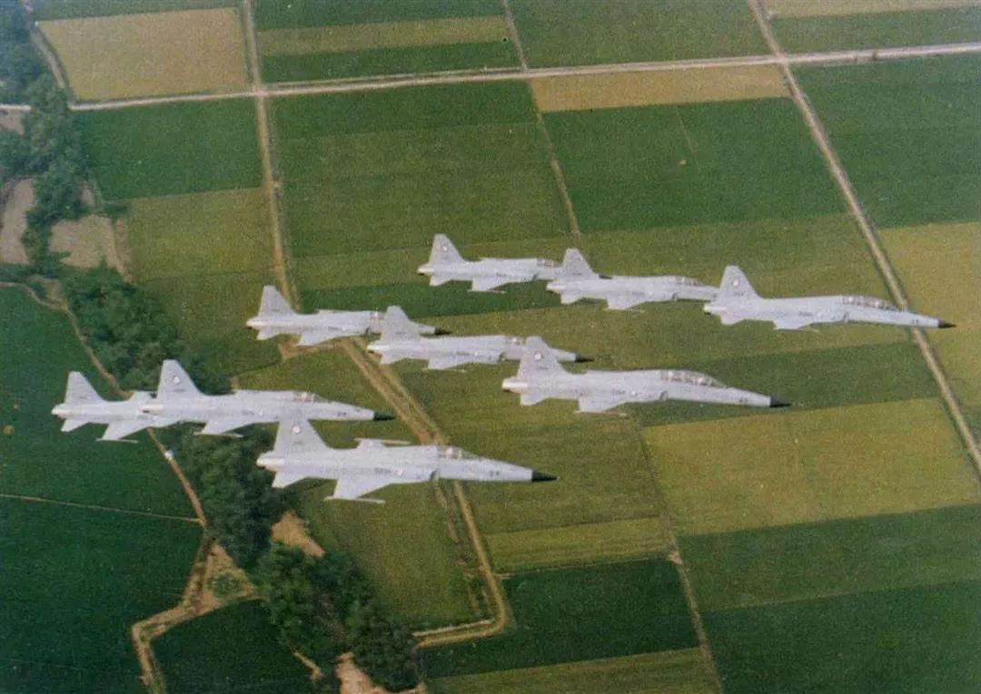 F—五E戰鬥機,以雷霆萬鈞之勢,編隊劃晴空而過。