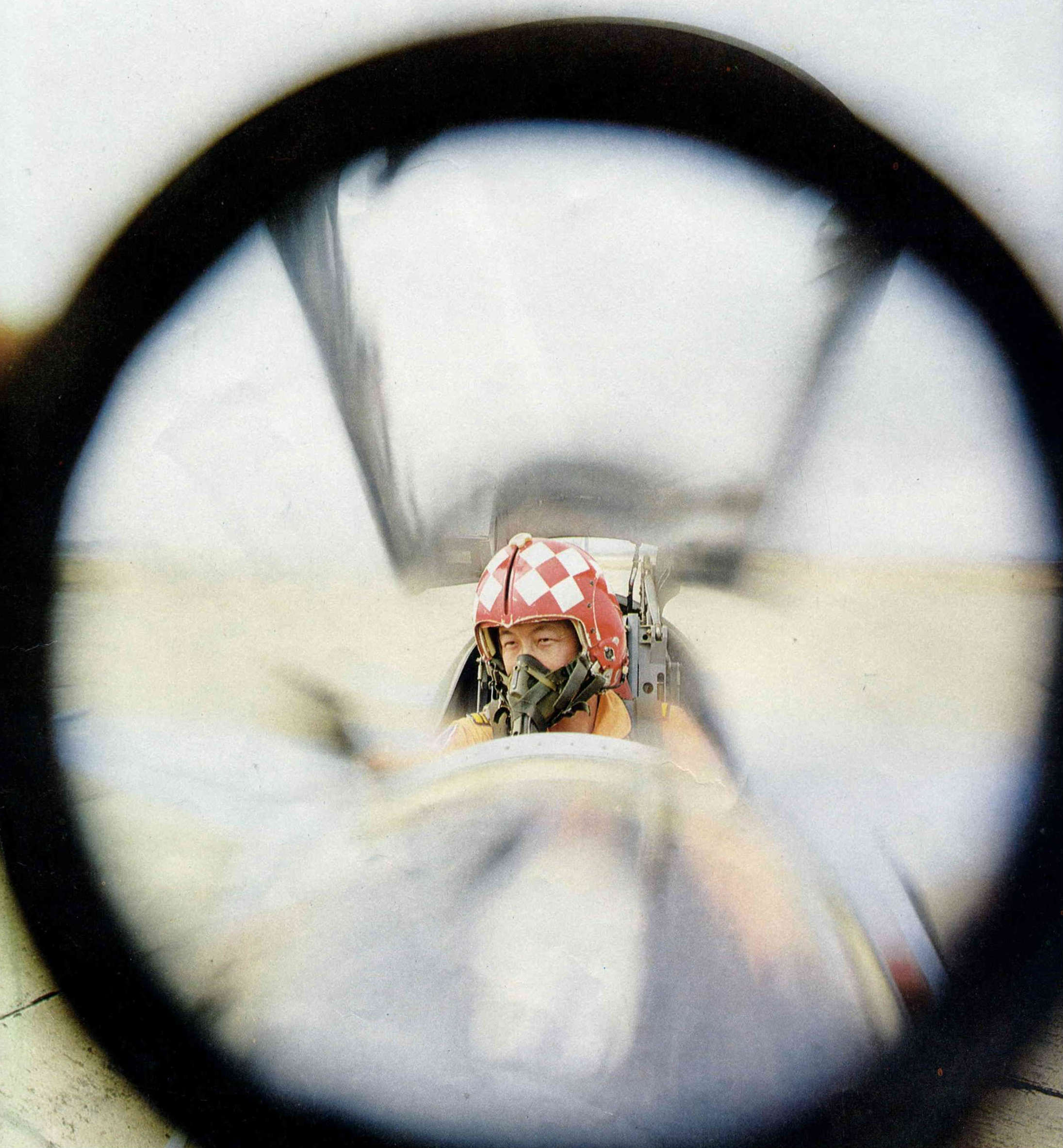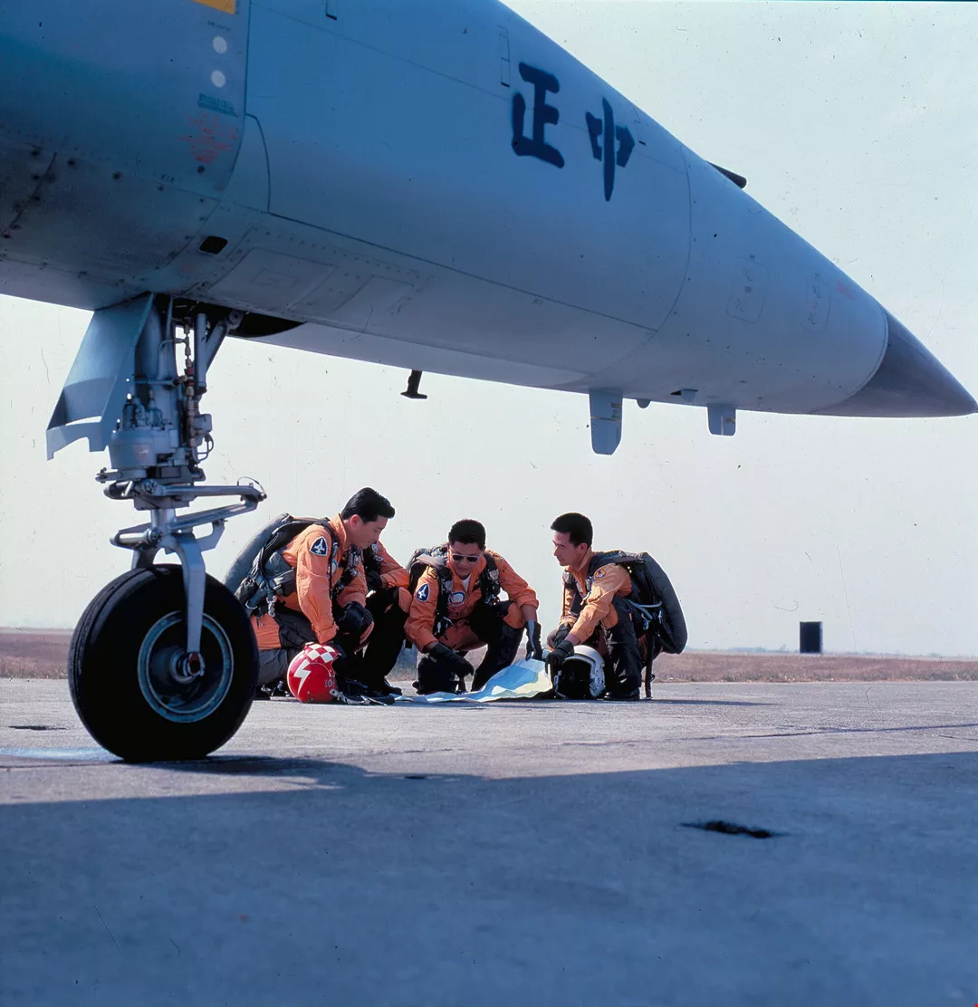 尚未闔上的駕駛艙裡,可以看見英姿勃發的飛行健兒,全副武裝,端坐在駕駛座上,正凝神屏息,等待出發的號令。機艙外,地勤人員也正以最快的速度,對飛機做最後的檢查。