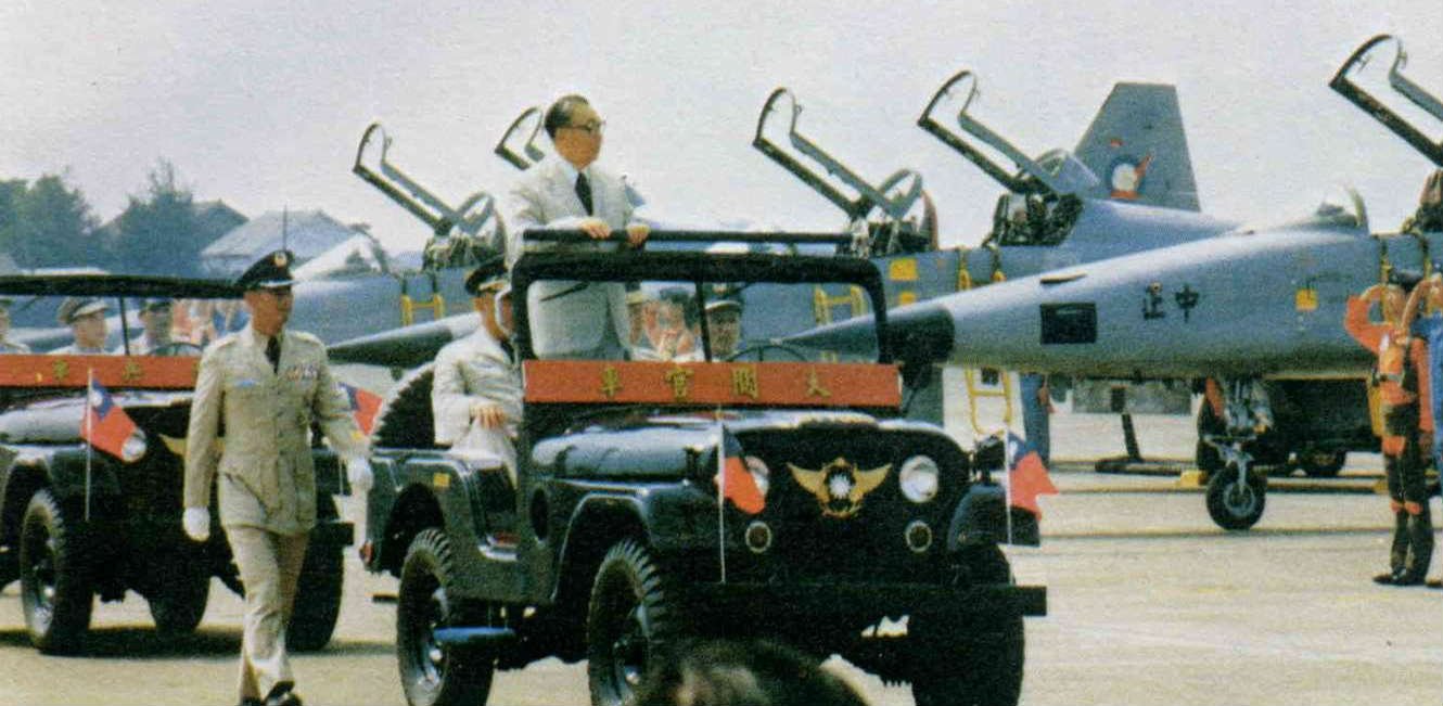 在參加大會的廿五萬海內外軍民和僑胞代表,以及電視機前全國觀眾的屏息注目下,上午十時廿八分,空軍自強中隊的十六架F—五E和二架F—五F戰鬥機,以兩個品字隊形,在一千呎的高空,以三百哩的時速,編隊飛越大會會場上空,向總統及全國同胞致敬。