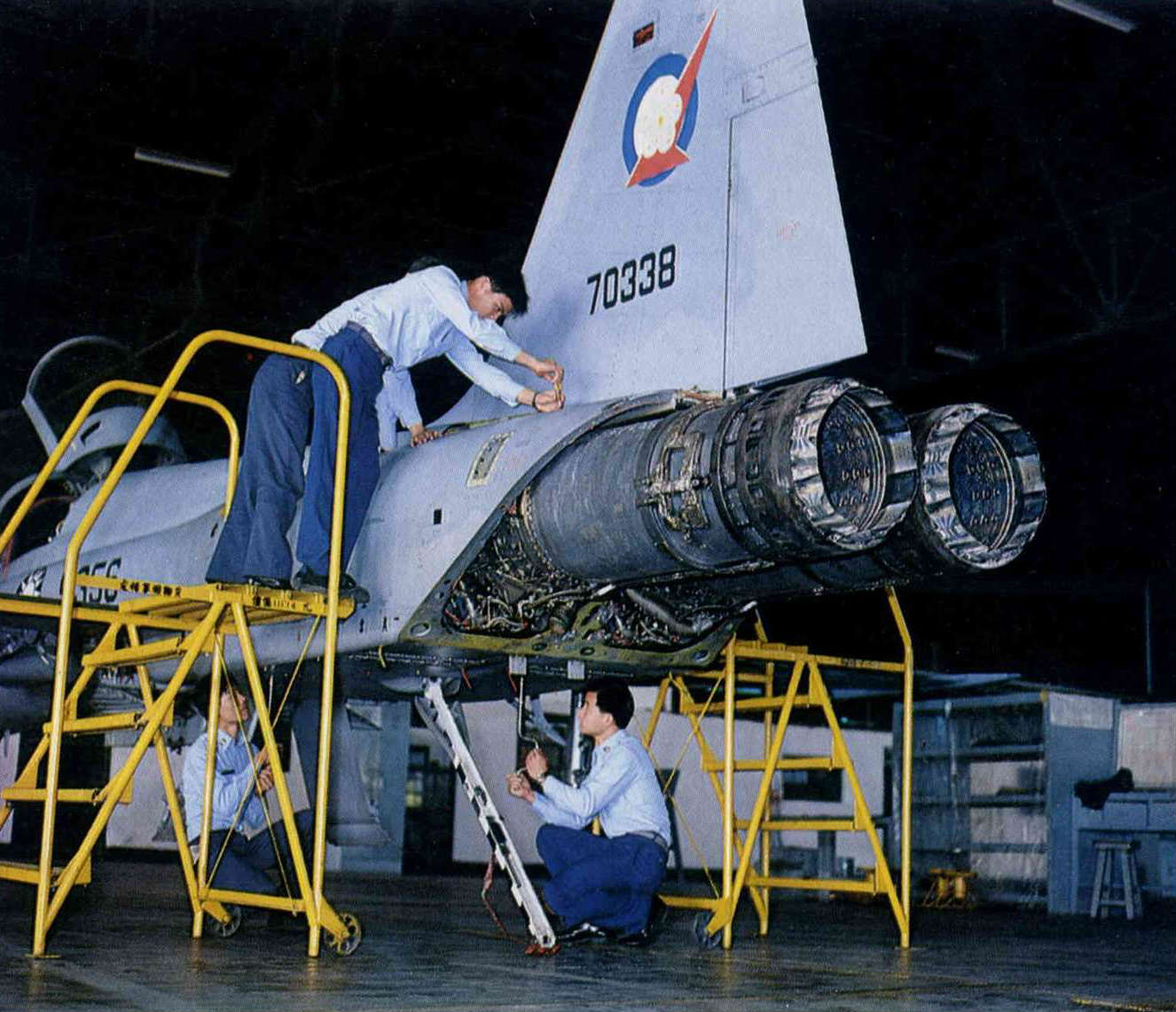 F—五E戰鬥機,是國人由外國購進部份零件後,自行裝配而成的第一種戰鬥機。圖中為F—五E在棚廠中接受例行保養修護的情形。