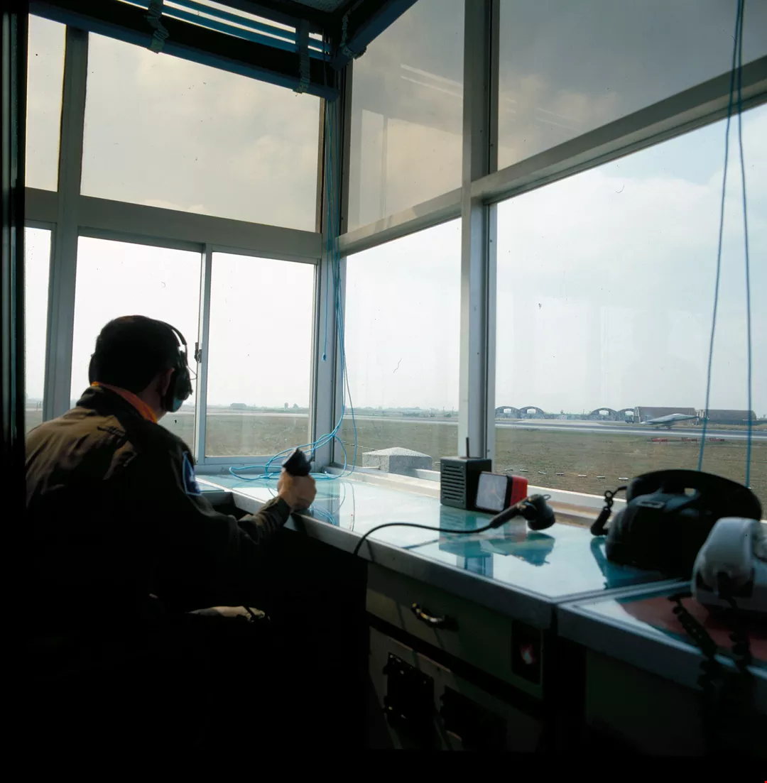 經驗豐富的飛行軍官,在「飛輔車」中,透過電訊設備,輔導飛機順利起飛與降落。