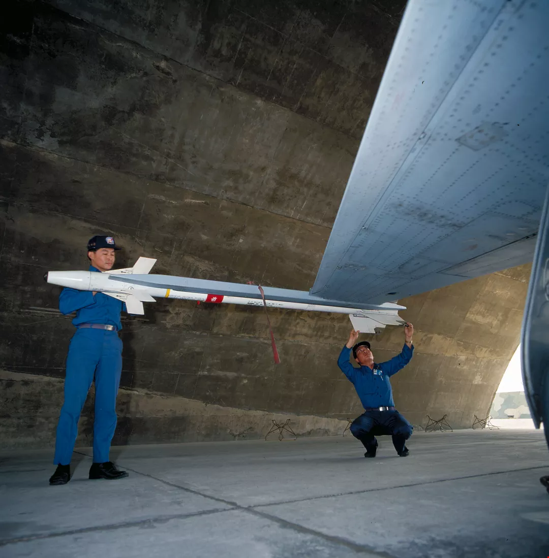 空軍地勤人員,正在為F—五E戰鬥機,掛上「響尾蛇飛彈」。