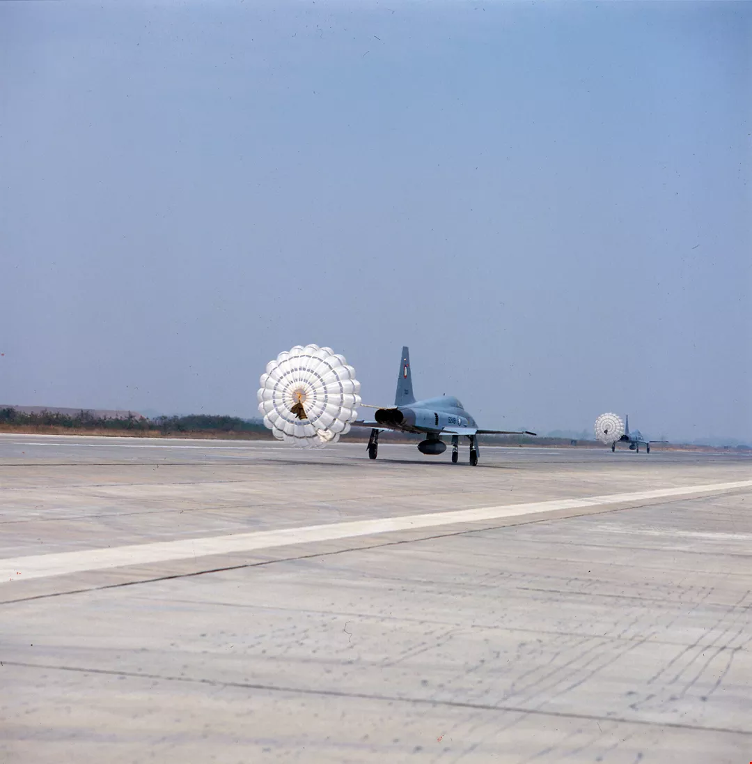 F—五E戰鬥機落地時,藉阻力傘以確保降落安全。