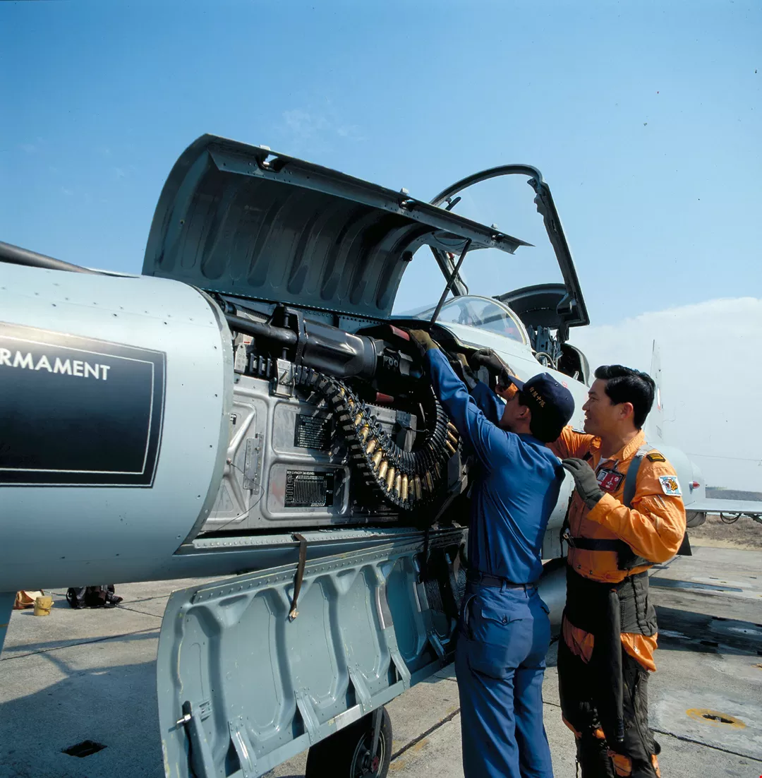 F—五E機身裝有機槍二管,地勤人員正在將子彈上膛。