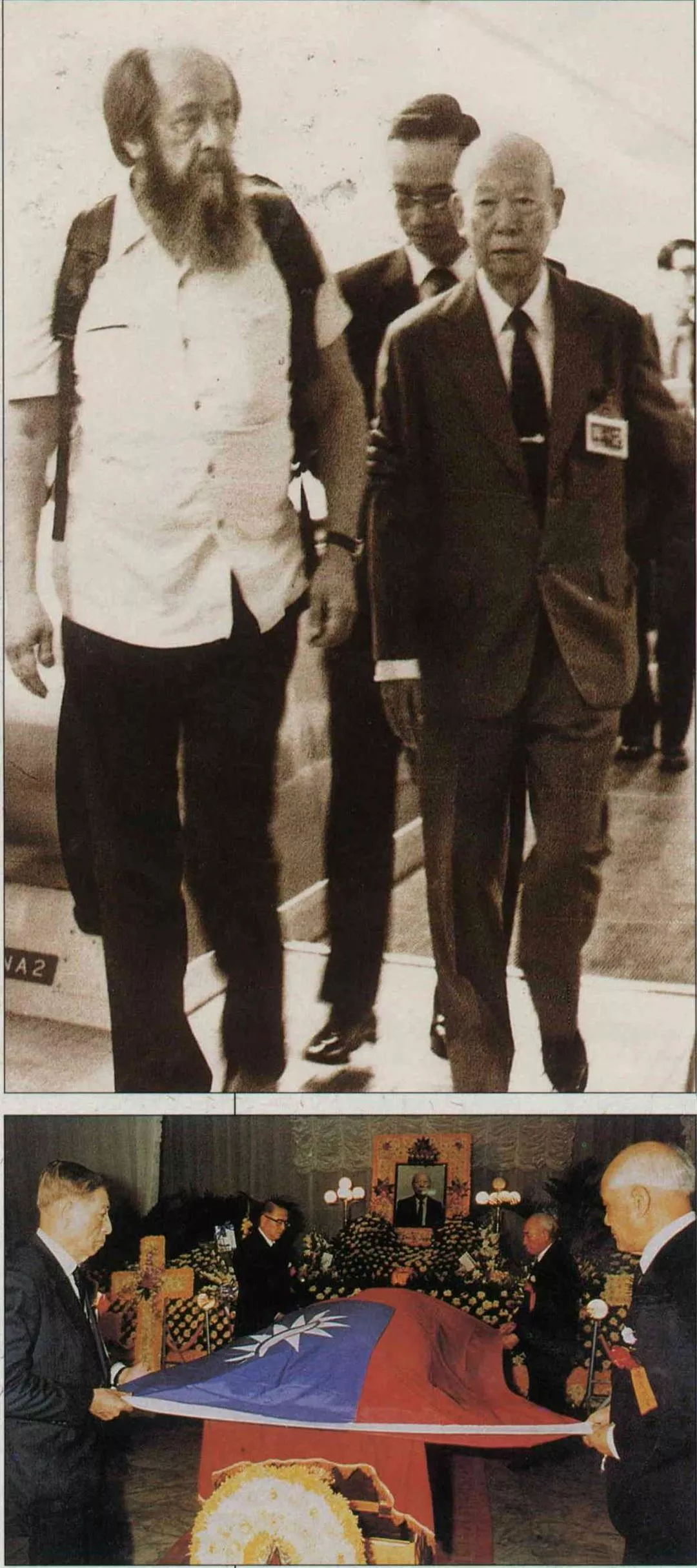 (上)民國七十一年,吳三連文教基金會邀請索忍尼辛來台。(下)民國七十七年十月,吳三連病逝。喪禮由李國鼎、林洋港等人為他的棺木覆蓋國旗,李總統親臨上香,備極哀榮。
