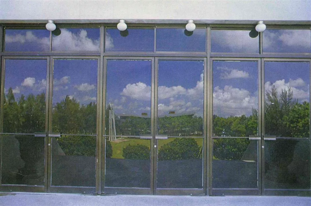 下圖:鐘塔、綠樹、草坪,反映在中正樓的玻璃門上。(鐘永和)