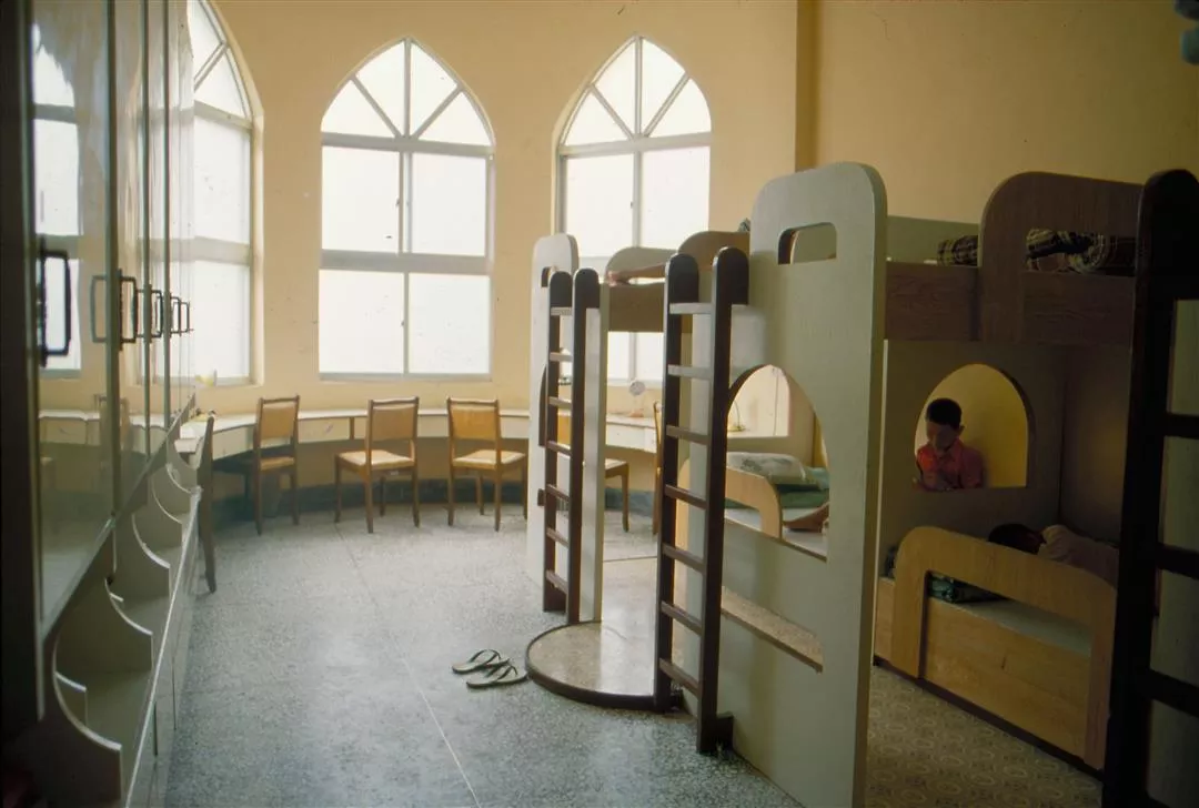 床鋪對面一排壁櫥,置放院童衣物用品。有窗的那面牆下,有一排貼壁而置的書桌,每張桌上都有盞台燈,桌前各有一把椅子。
