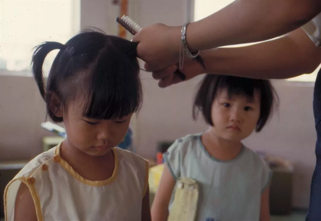 老師為小朋友整理頭髮。(歐陽芷汀)