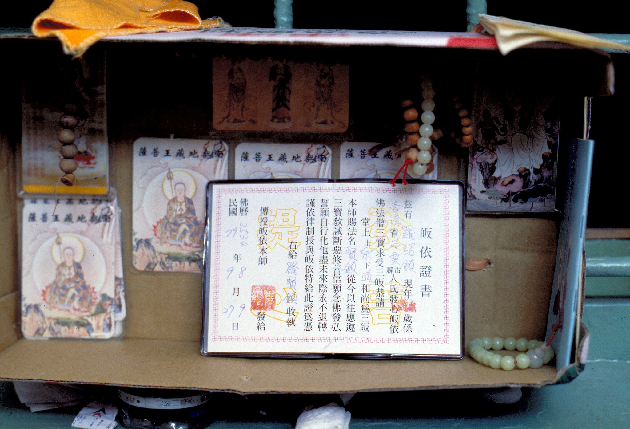 一張皈依證、幾幀佛像、念珠,觀護所的孩子就在獄舍內佈置出一間小佛堂。(邱瑞金)