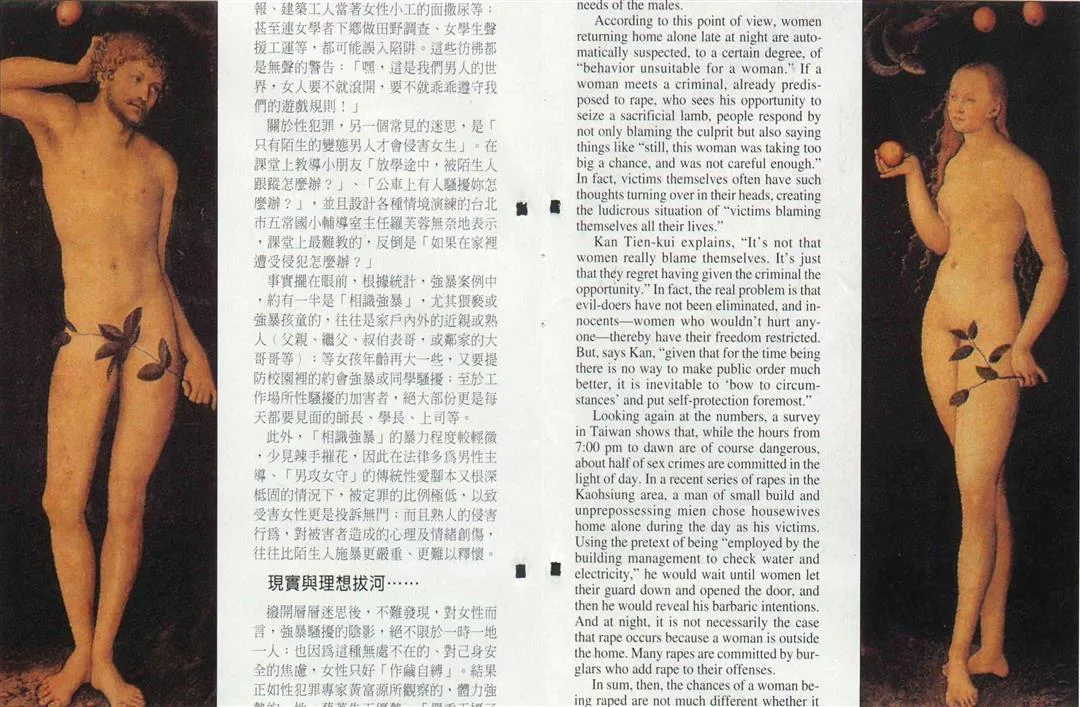 「對大多數男性來說,性犯罪實在太遙遠,」為「現代婦女基金會」草擬「性侵害犯罪防治法」的輔仁大學法律學研究所教授甘添貴指出,「不為錢、不為情,無冤無仇,純粹因為妳天生的弱勢性別,就被姦殺、被騷擾。這種焦慮,一般身強力壯的男性根本不能體會,也不覺得有必要去搞清楚。」