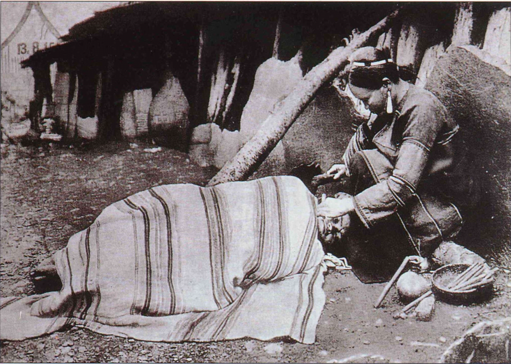 在日據大正十五年(一九二六年)的一張照片中,泰雅族的文面師正在為一名女子施術,全身裹著麻布的泰雅女子橫躺在地上,眼睛緊閉著,牙根緊咬著,看來正在忍受極大的痛苦。臉上也是黥面的文面師蹲坐著,拿著一枝看似鎚狀的工具,往女子臉上敲打。