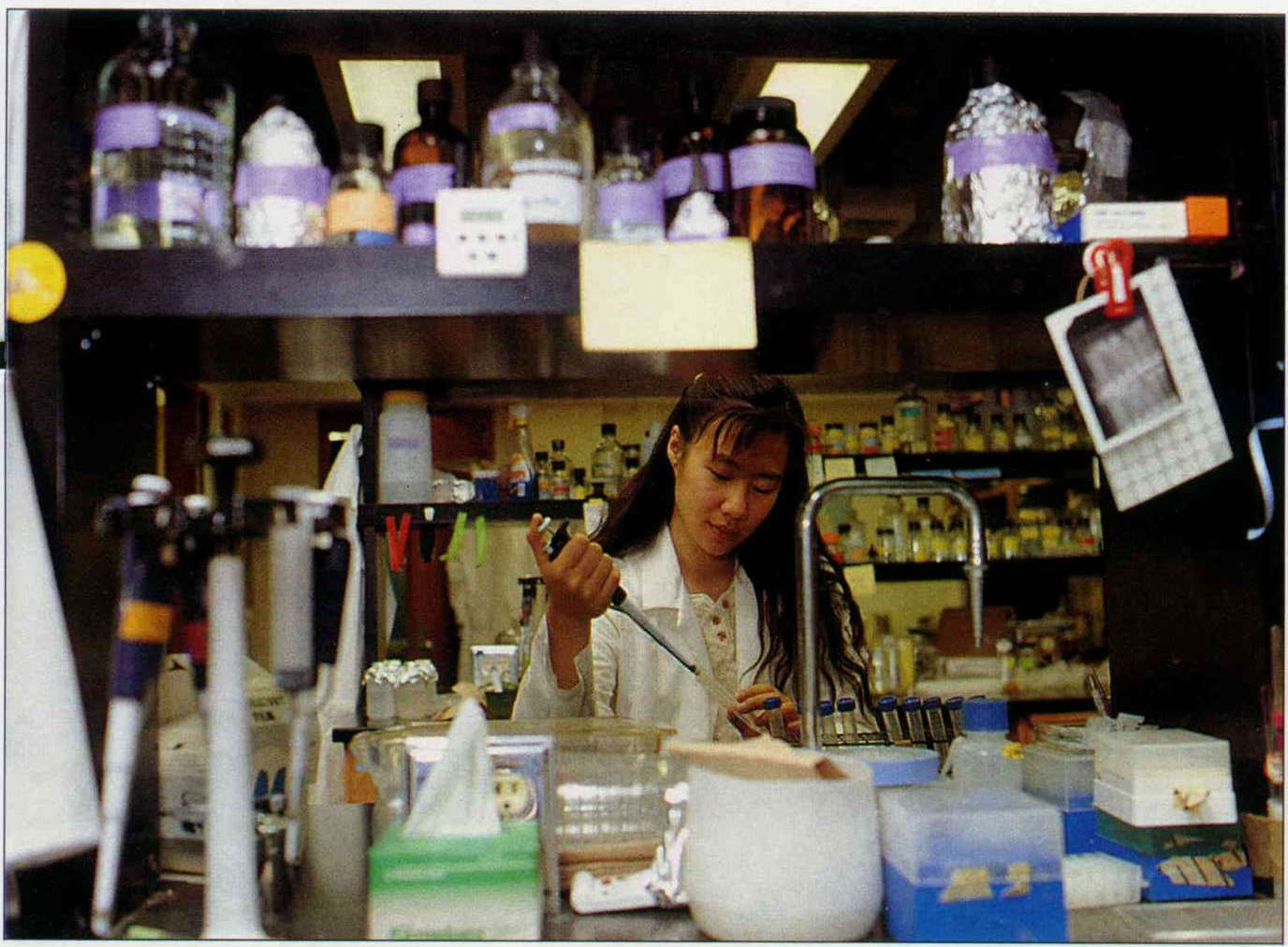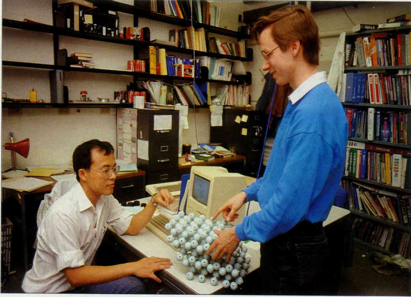 一九八九到九○的兩年之間,康乃爾理科方面出了三位諾貝爾得主,使理科各系精神大振,也成為康乃爾經費最充裕的部門。圖為物理系博士班學生正在討論分子結構。(卜華志)